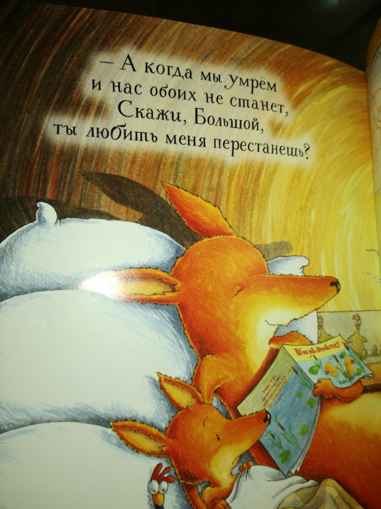 Замечательная книга о родительской любви, о том, что эта любовь не угасает несмотря ни на что, кем бы ты не был- злым или добрым, медвежонком, букашкой или крокодилом - любовь никогда не исчезнет... Даже если мы умрем... Вот последние строчки: -А когда мы умрем и нас обоих не станет, скажи, Большой, ты любить меня перестанешь? Большой подошел и встал у окна, В небе ночном сияла луна, И звезды сверкали в небесной дали, словно что-то сказать хотели, но не могли. -Смотри, как светят звёзды в окно, Светят и те, что погибли давно. Они освещают моря, города. Любовь, как их свет, не умрёт никогда"