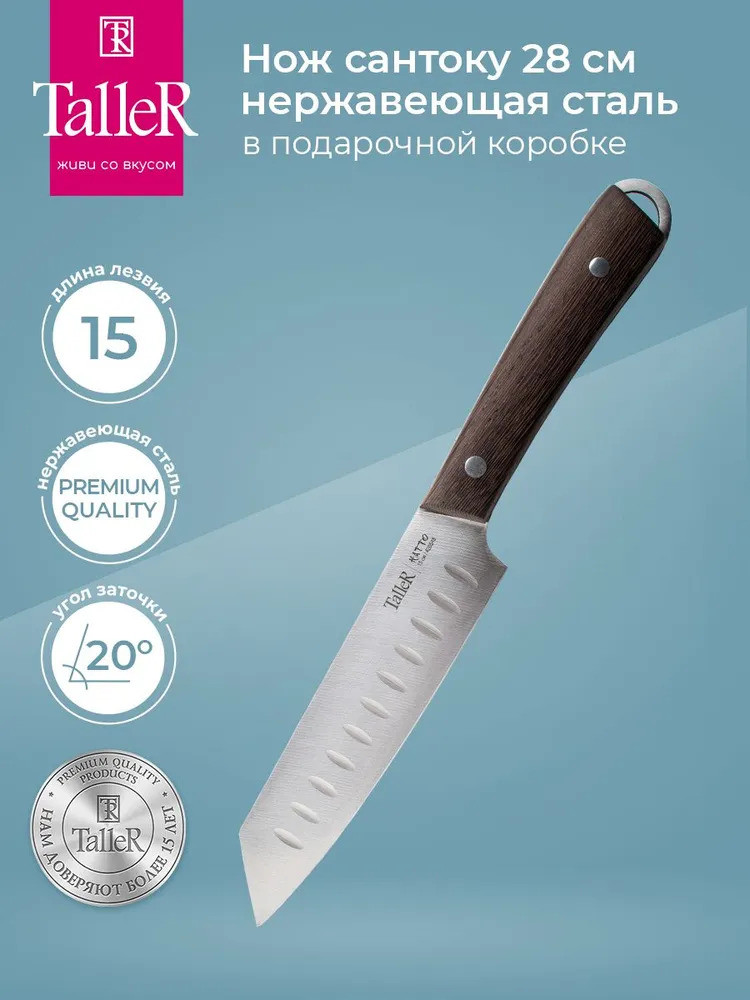 TalleR Нож сантокуВ данный момент этот товар отсутствует в продаже. Возможно, у нас найдется аналогичный или похожий товар здесь. Серия: Катто Нож сантоку TalleR TR-22054 Катто подходит для нарезки мяса, рыбы или овощей. Длина лезвия - 15 см, ширина лезвия - 3,6 см, толщина лезвия - 2,3 мм. Лезвие ножа сделано из высококачественной нержавеющей стали AISI 420S45. Ручка выполнена из нержавеющей стали и дерева венге. Есть отверстие для подвешивания. Используйте для заточки точилки TalleR или аналогичные (или точильные камни, мусаты). Рекомендуется ручная мойка. |