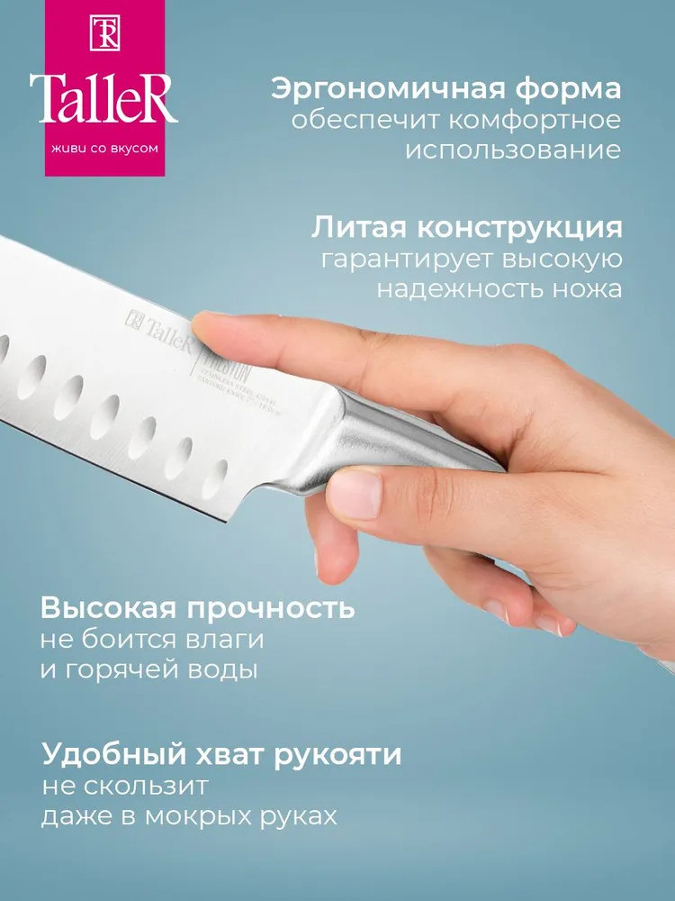 TalleR Нож сантокуВ данный момент этот товар отсутствует в продаже. Возможно, у нас найдется аналогичный или похожий товар здесь. Серия: Престон Нож сантоку TalleR TR-22075 Престон подходит для нарезки мяса, рыбы, овощей и других целей. Толщина лезвия - 2,5 мм. Ширина лезвия - 4,5 см. Лезвие ножей сделано из высококачественной коррозионностойкой стали AISI 420S45. Ручка выполнена из нержавеющей стали. Используйте для заточки точилки TalleR или аналогичные. Рекомендуется ручная мойка. |