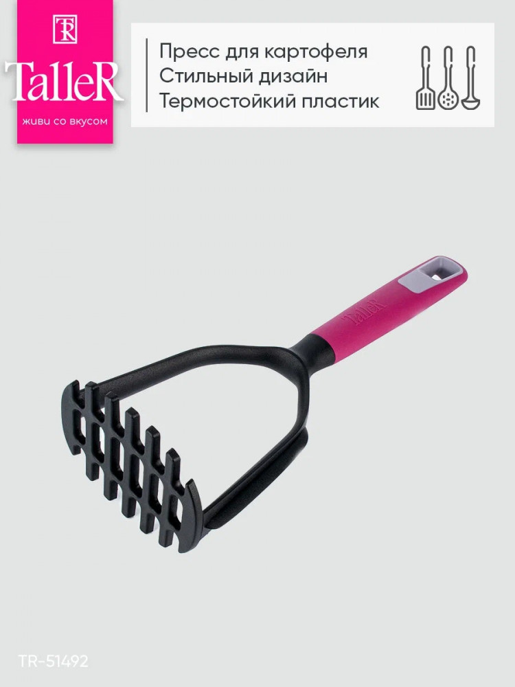 Картофелемялка TalleR TR-51492. Безопасный термостойкий пластик выдерживает температуру до 210°C. Есть отверстие для подвешивания. Пригоден для мойки в посудомоечной машине без использования агрессивных и абразивных моющих средств.