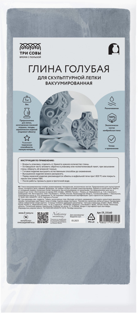 Три совы Глина для скульптурной лепки вакуумированная, голубая