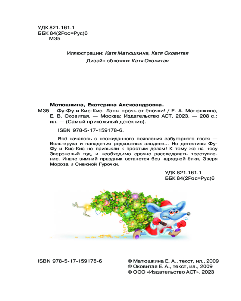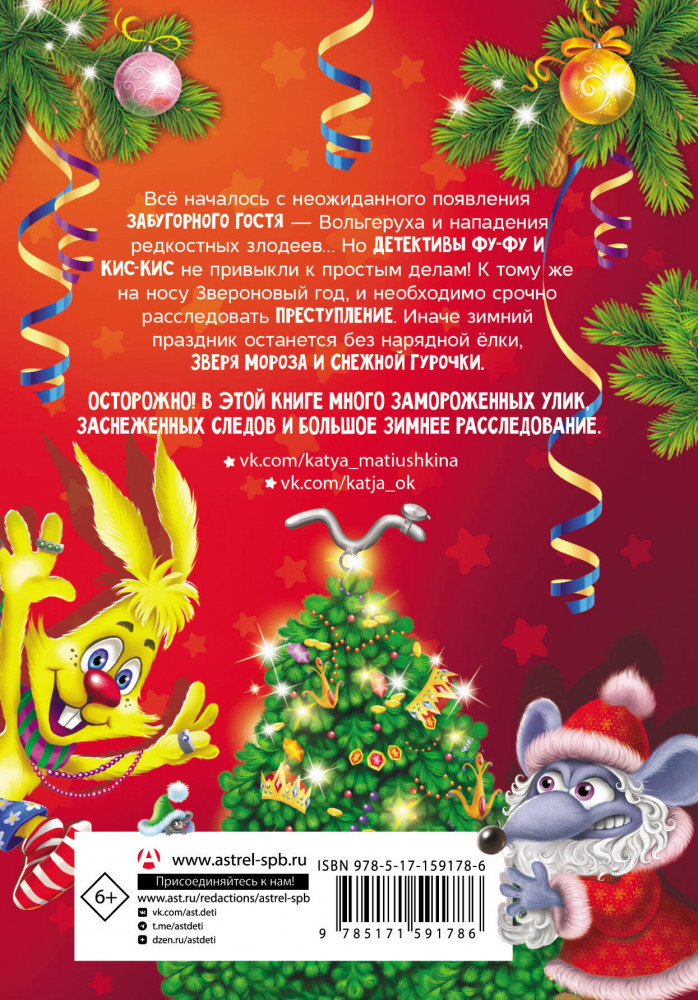 Фу-Фу и Кис-Кис. Лапы прочь от ёлочки!Катя Оковитая, Екатерина Александровна Матюшкина В данный момент этот товар отсутствует в продаже. Возможно, у нас найдется аналогичный или похожий товар здесь. Серия: Самый прикольный детектив Всё началось с неожиданного появления забугорного гостя — Вольгеруха и нападения редкостных злодеев... Но детективы Фу-Фу и Кис-Кис не привыкли к простым делам! К тому же на носу Звероновый год, и необходимо срочно расследовать преступление. Иначе зимний праздник останется без нарядной ёлки, Зверя Мороза и Снежной Гурочки.  |
