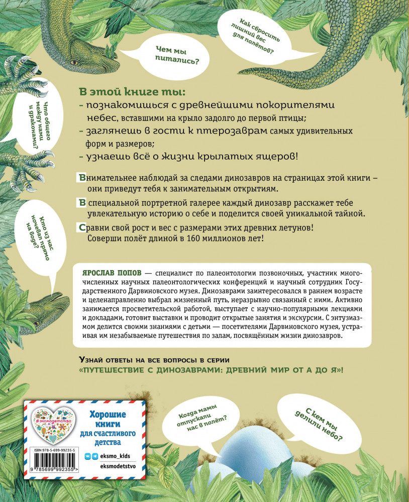 В данный момент этот товар отсутствует в продаже. Возможно, у нас найдется аналогичный или похожий товар здесь. Серия: Путешествие с динозаврами: древний мир от А до Я Многие считают, что доисторические ящеры с кожистыми крыльями — это тоже динозавры. На самом деле, это их дальние родственники — птерозавры! Они существовали бок о бок с «ужасными ящерами» и получили неоспоримый титул королей доисторического неба. И, главное, их далёкие потомки по сей день кружат в воздухе над нами. Давай познакомимся с древними рептилиями, покорившими небо, и посмотрим на мир мезозоя с высоты их полёта!
