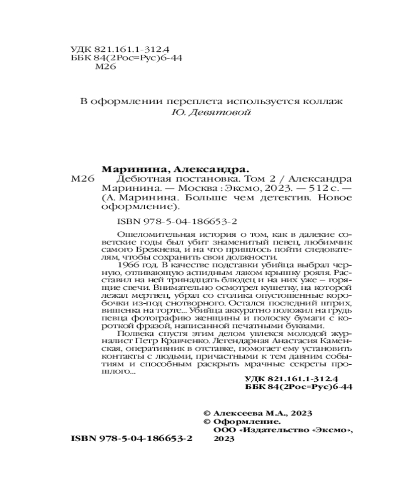 Серия: А.Маринина. Больше чем детектив. Новое оформление Ошеломительная история о том, как в далекие советские годы был убит знаменитый певец, любимчик самого Брежнева, и на что пришлось пойти следователям, чтобы сохранить свои должности. |