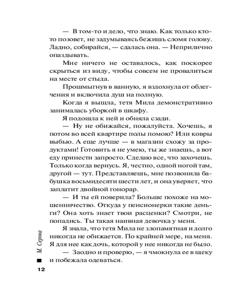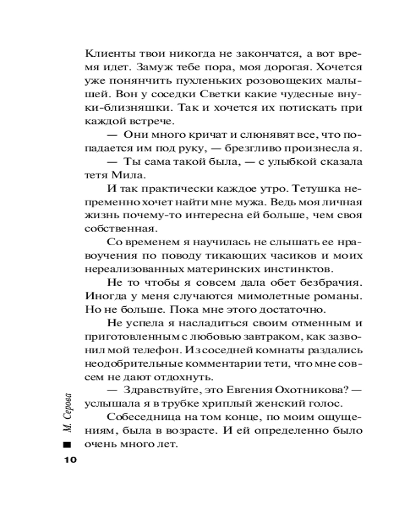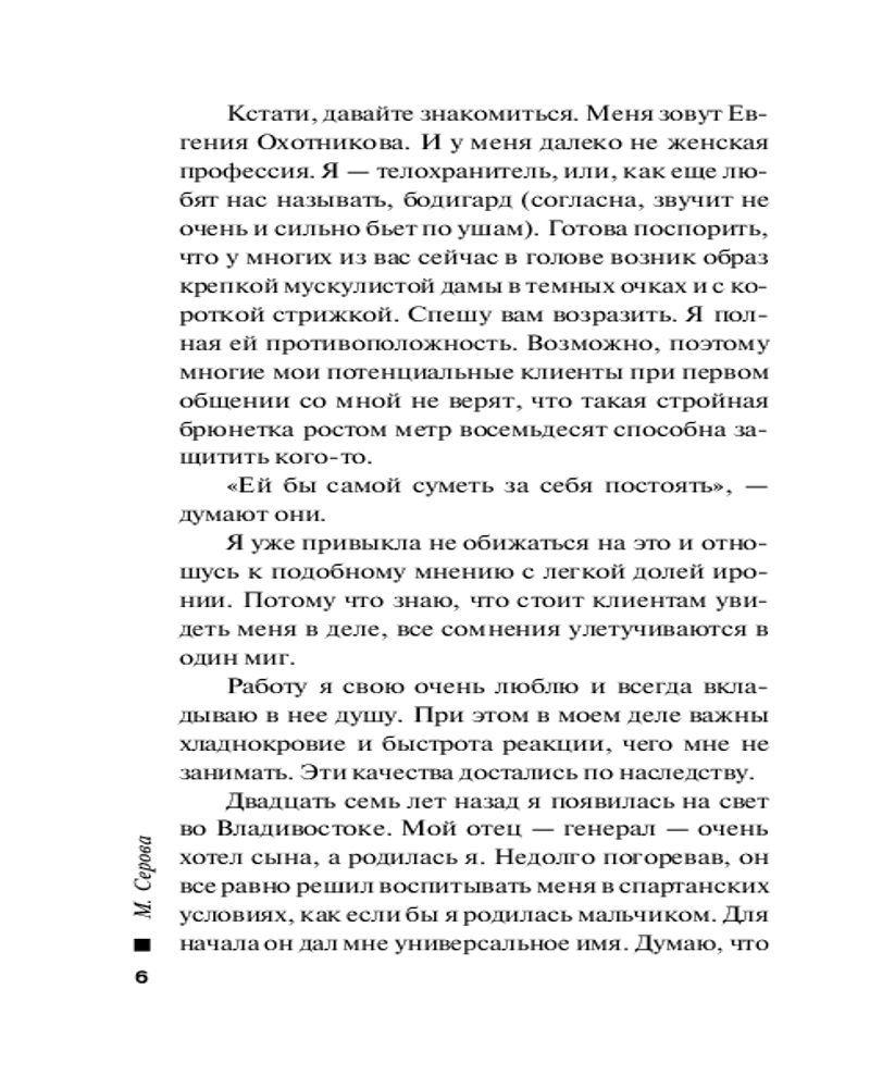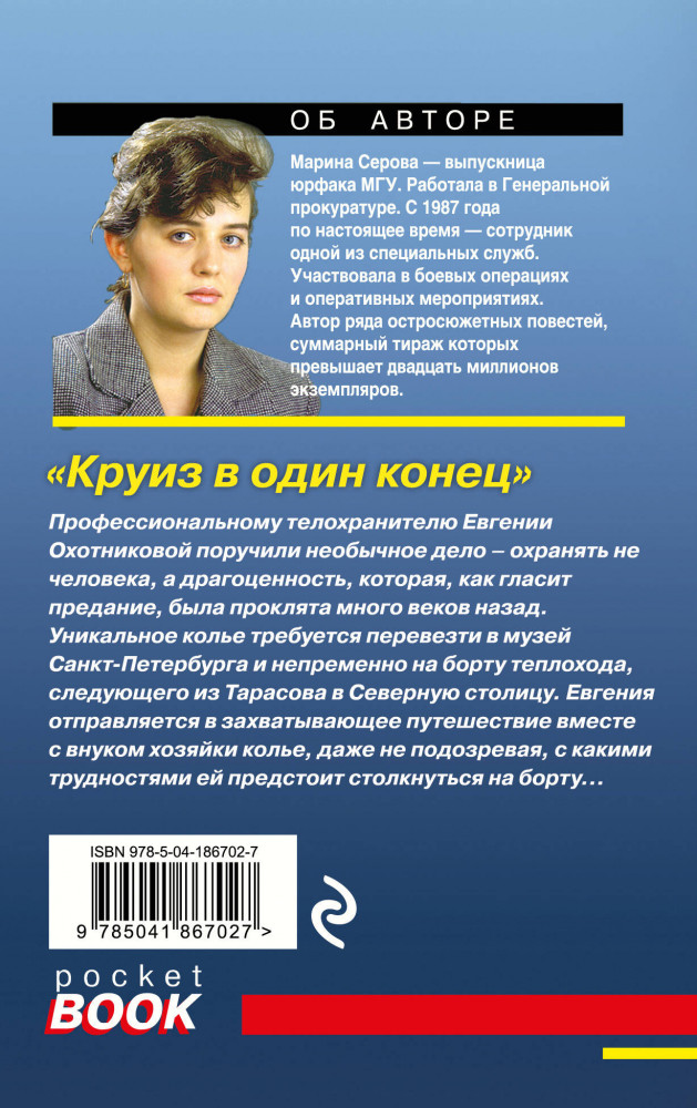 | Марина Сергеевна Серова — один из ведущих авторов серии современного русского детективного жанра (существует версия, что это коллектив авторов под общим руководством литературного агента Сергея Потапова). Согласно легенде, «выпускница юридического факультета МГУ, работала в Генеральной прокуратуре, сотрудница одной из спецслужб, участвовала в боевых операциях». Между тем написала 425 произведений размером порядка 200 страниц (и число их постоянно увеличивается). Часть произведений... |