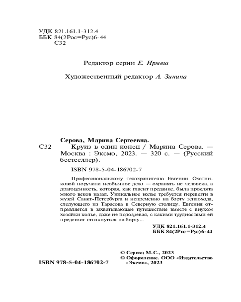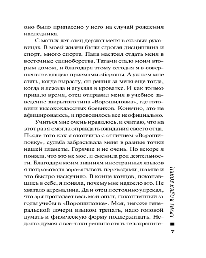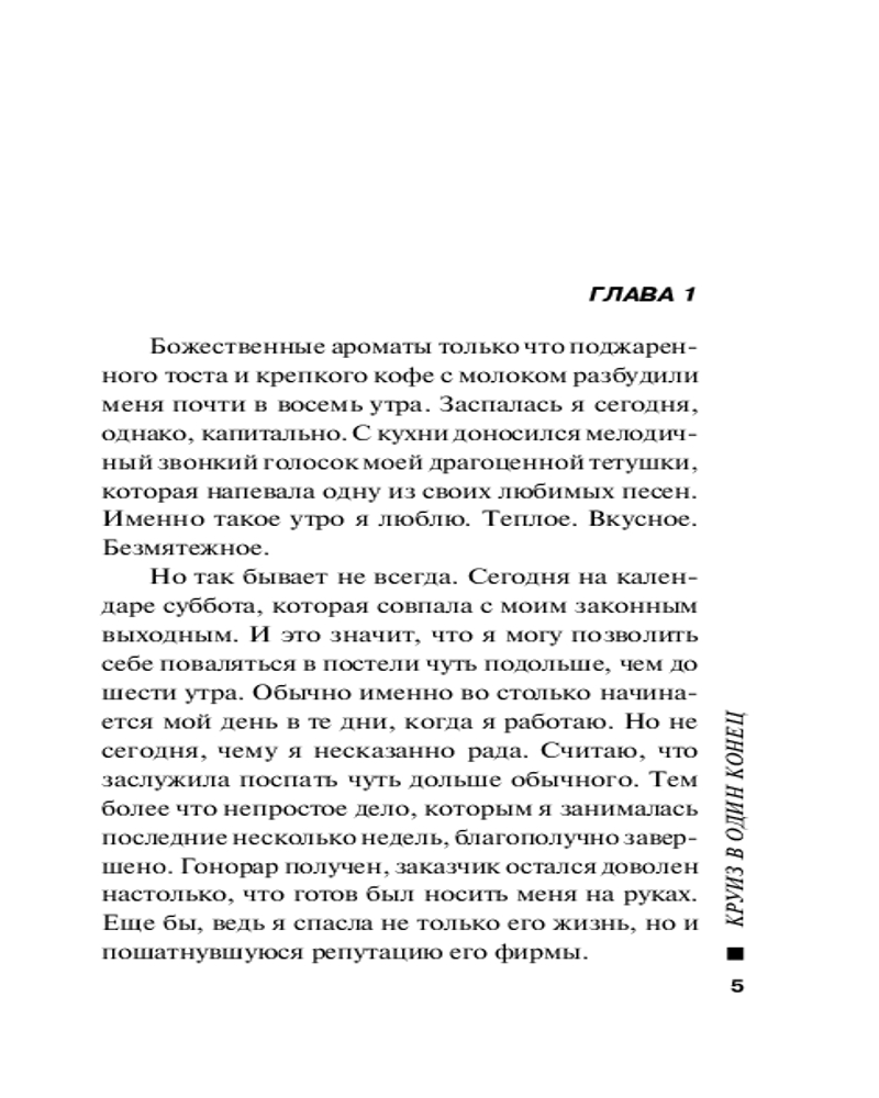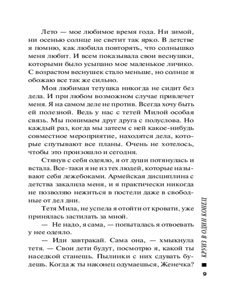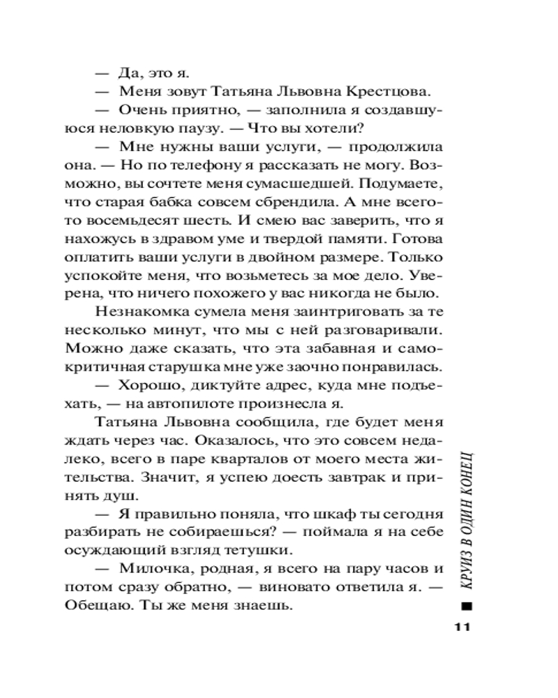 Круиз в один конецВ данный момент этот товар отсутствует в продаже. Возможно, у нас найдется аналогичный или похожий товар здесь. Серия: Русский бестселлер (обложка) Профессиональному телохранителю Евгении Охотниковой поручили необычное дело — охранять не человека, а драгоценность, которая, как гласит предание, была проклята много веков назад. Уникальное колье требуется перевезти в музей Санкт-Петербурга, и непременно на борту теплохода, следующего из Тарасова в северную столицу. Евгения отправляется в захватывающее приключение вместе с внуком хозяйки колье, даже не подозревая, с какими трудностями ей предстоит столкнуться на борту... |