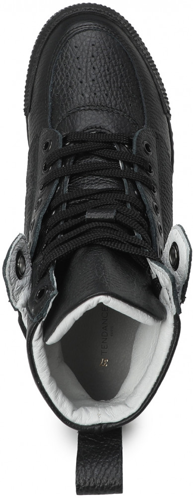 Кеды высокие женские французского бренда Tendance. Верх модели сделан из натуральной кожи. Шнуровка поможет отрегулировать плотность посадки. Подкладка и стелька выполнены из натуральной кожи теленка. Резиновая подошва прочная и устойчивая к истиранию. Эти кеды можно сочетать с различными образами в уличном спортивном стиле. Толщина подошвы — 3,5 см. Способ соединения подошвы — прошитая. Высота обуви — 11,5 см. Технология производства — стробел (Strobel).