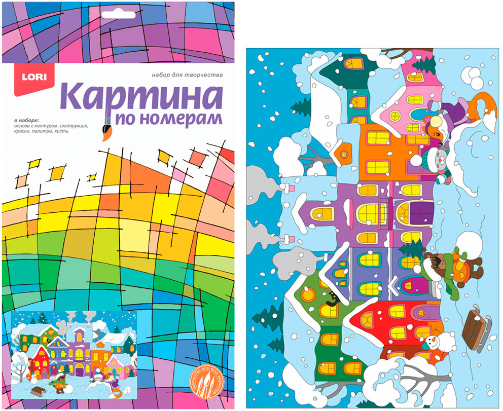 В набор входит картина для раскрашивания, на которую нанесена нумерованная схема рисунка, набор акриловых красок и кисть. Задача — аккуратно раскрасить картинку по номерам. После высыхания краску можно закрепить акриловым лаком, который защитит изображение и придаст картине законченный вид.