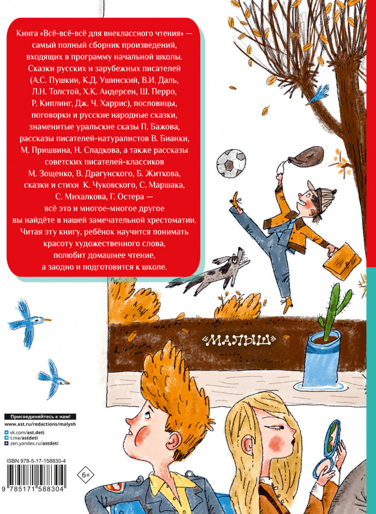 Серия: Большая книга лучшей классики Книга «Всё-всё-всё для внеклассного чтения» — самый полный сборник произведений, входящих в программу начальной школы.Сказки русских и зарубежных писателей (А.С. Пушкин, К.Д. Ушинский, В.И. Даль, Л.Н. Толстой, Х.К. Андерсен, Ш. Перро, Р. Киплинг, Дж. Ч. Харрис), пословицы, поговорки и русские народные сказки, знаменитые уральские сказы П. Бажова, рассказы писателей-натуралистов В. Бианки, М. Пришвина, Н. Сладкова, а также рассказы советских писателей-классиков М. Зощенко, В. Драгунского, Б. Житкова, сказки и стихи К. Чуковского, С. Маршака, С. Михалкова, Г. Остера — всё это и многое-многое другое вы найдёте в нашей замечательной хрестоматии. Читая эту книгу, ребёнок научится понимать красоту художественного слова, полюбит домашнее чтение, а заодно и подготовится к школе. |