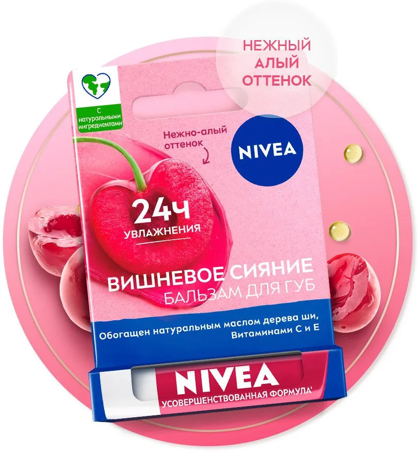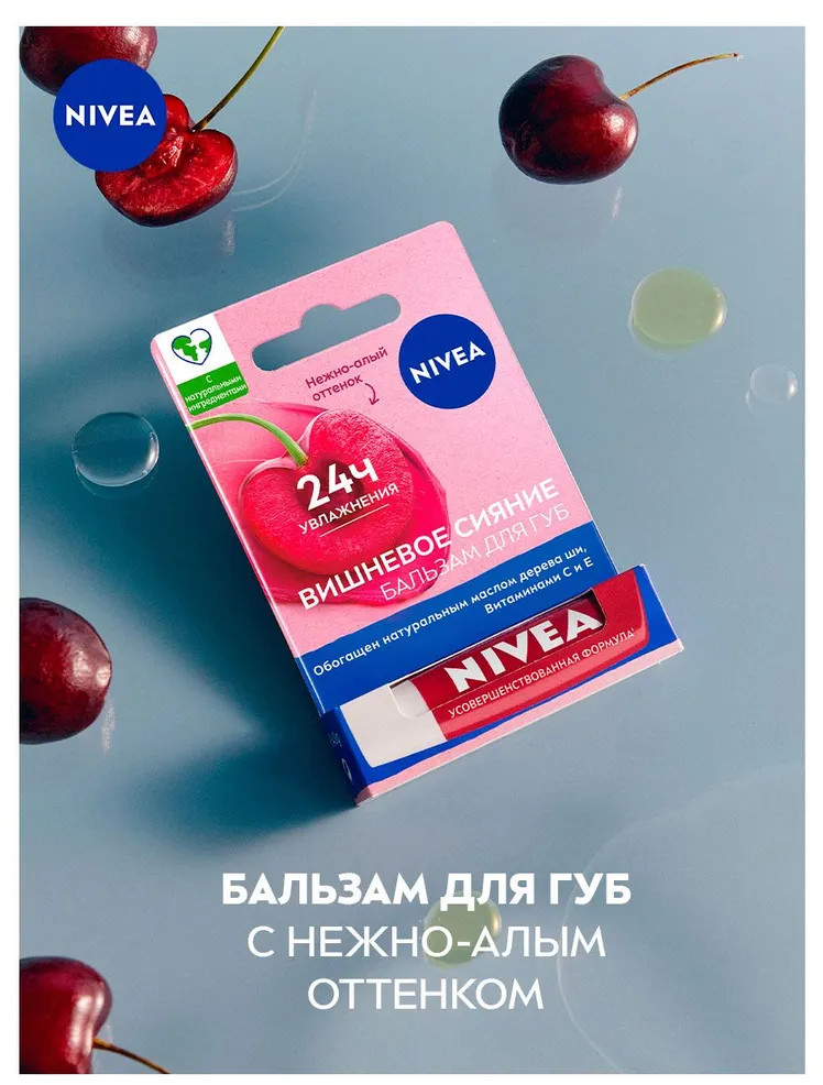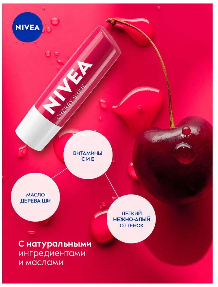 NIVEA Бальзам для губ «Вишневое сияние» с маслом дерева ши и витаминами С и Е-20% увлажнение вишнёвый запах придаёт оттенок не липкий