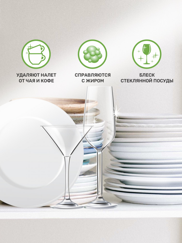 Таблетки для посудомоечной машины хорошего качества , не оставляет разводов и подтеков, на посуде не остается налет от средства.