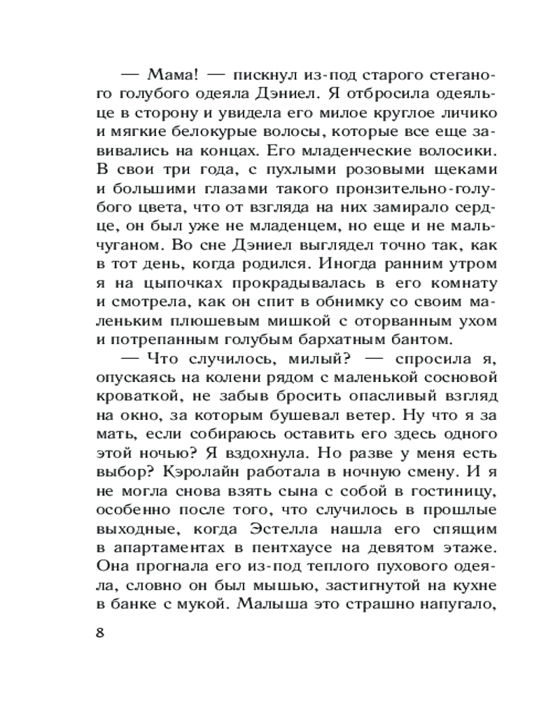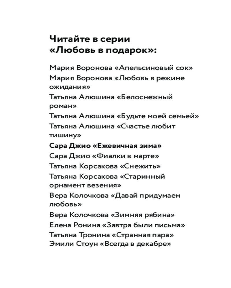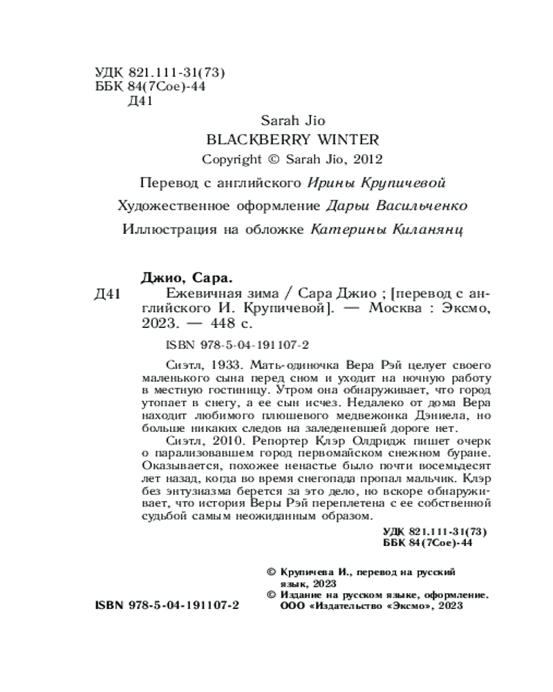 Ежевичная зимаВ данный момент этот товар отсутствует в продаже. Возможно, у нас найдется аналогичный или похожий товар здесь. Серия: Любовь в подарок Тайна, скрытая под снегом. Любовь, растопившая лед. Сиэтл, 1933. Мать-одиночка Вера Рэй целует своего маленького сына перед сном и уходит на ночную работу в местную гостиницу. Утром она обнаруживает, что город утопает в снегу, а ее сын исчез. Недалеко от дома Вера находит любимого плюшевого медвежонка Дэниела, но больше никаких следов на заледеневшей дороге нет. |