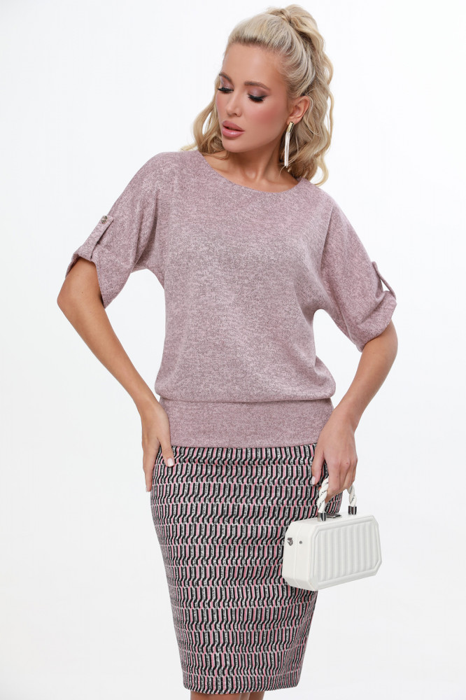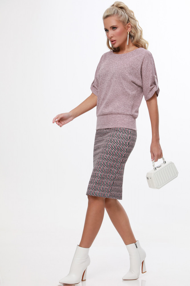 Комфортный и элегантный костюм на каждый день. Юбка-карандаш незаменима при создании делового образа. Компанию ей составляет свободная блузка с цельнокроеным рукавом, украшенным патами, с широким поясом.