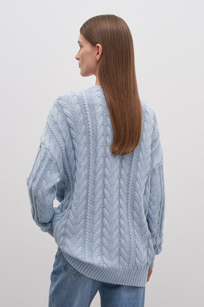 ровная сшивка, идеально симметричные косы. никогда не носила голубой, сейчас в моде, решила приобрести к голубому пальто. смотрится великолепно. брала размер в размер, объем нормальный