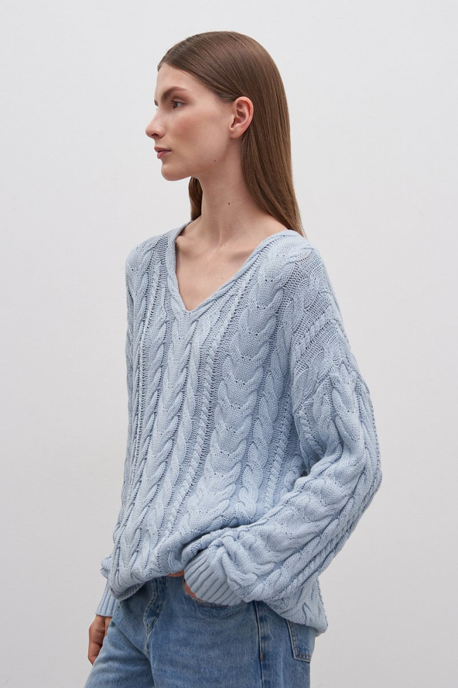 ровная сшивка, идеально симметричные косы. никогда не носила голубой, сейчас в моде, решила приобрести к голубому пальто. смотрится великолепно. брала размер в размер, объем нормальный