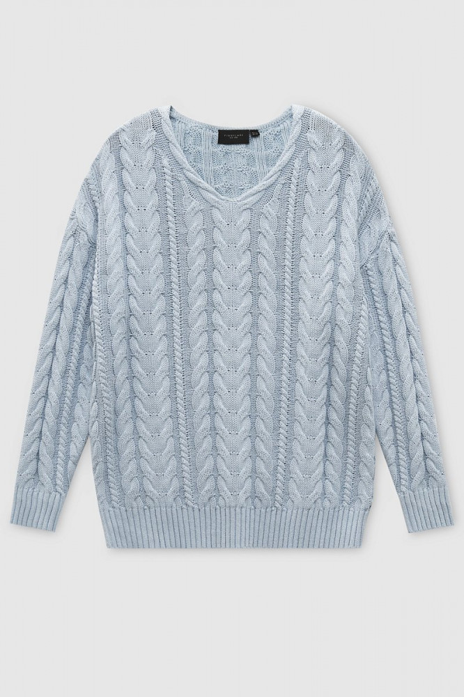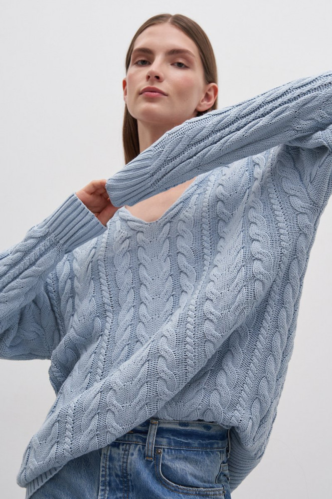ровная сшивка, идеально симметричные косы. никогда не носила голубой, сейчас в моде, решила приобрести к голубому пальто. смотрится великолепно. брала размер в размер, объем нормальный