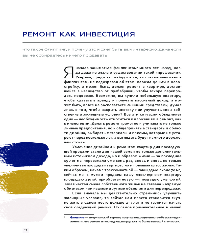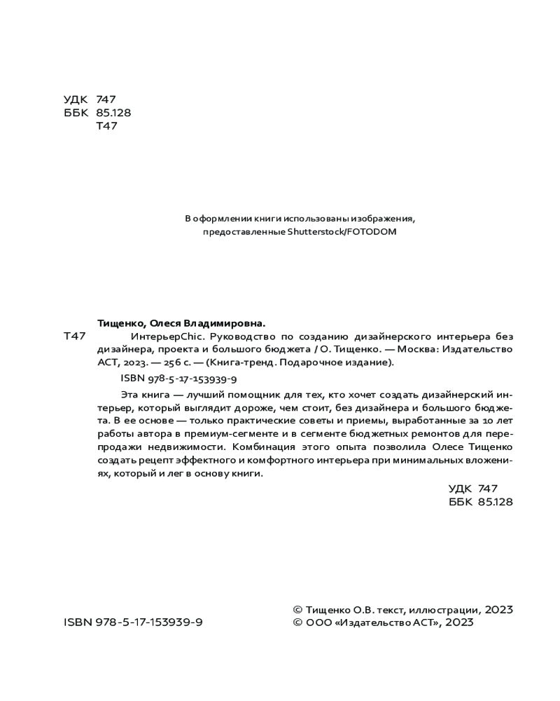Серия: Книга-тренд. Подарочное издание Эта книга — лучший помощник для тех, кто хочет создать дизайнерский интерьер, который выглядит дороже, чем стоит, без дизайнера и большого бюджета. В ее основе — только практические советы и приемы, выработанные за 10 лет работы автора в премиум-сегменте и в сегменте бюджетных ремонтов для перепродажи недвижимости. Комбинация этого опыта позволила Олесе Тищенко создать рецепт эффектного и комфортного интерьера при минимальных вложениях, который и лег в основу книги. |