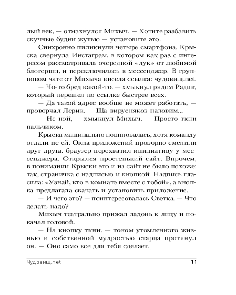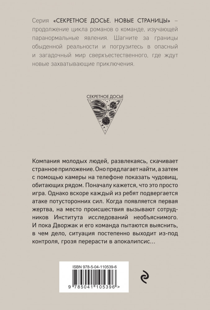 Серия: Секретное досье. Новые страницы (обложка) Компания молодых людей, развлекаясь, скачивает странное приложение. Оно предлагает найти, а затем с помощью камеры на телефоне показать чудовищ, обитающих рядом. Поначалу кажется, что это просто игра. Однако вскоре каждый из ребят подвергается атаке потусторонних сил. Когда появляется первая жертва, на место происшествия вызывают сотрудников Института исследований необъяснимого. И пока Дворжак и его команда пытаются выяснить, в чем дело, ситуация постепенно выходит из-под контроля, грозя перерасти в апокалипсис... |