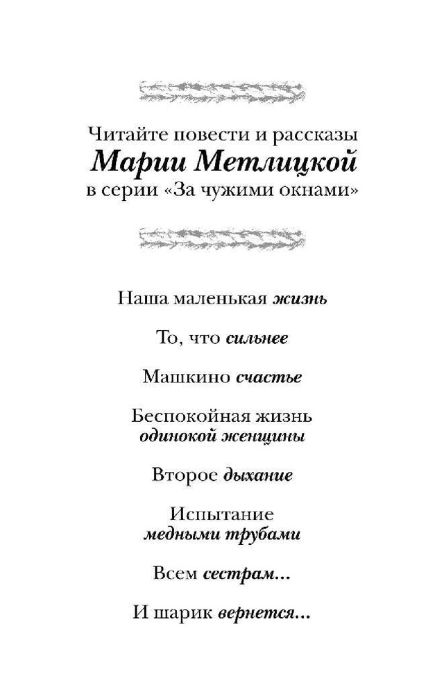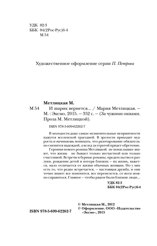 И шарик вернется...В данный момент этот товар отсутствует в продаже. Возможно, у нас найдется аналогичный или похожий товар здесь. Серия: За чужими окнами. Проза М. Метлицкой и А. Борисовой В молодости даже самые незначительные неприятности кажутся вселенской трагедией. В зрелости приходит мудрость, и начинаешь понимать, что разочарование обязательно сменится надеждой, а вслед за утратой придет обретение. |