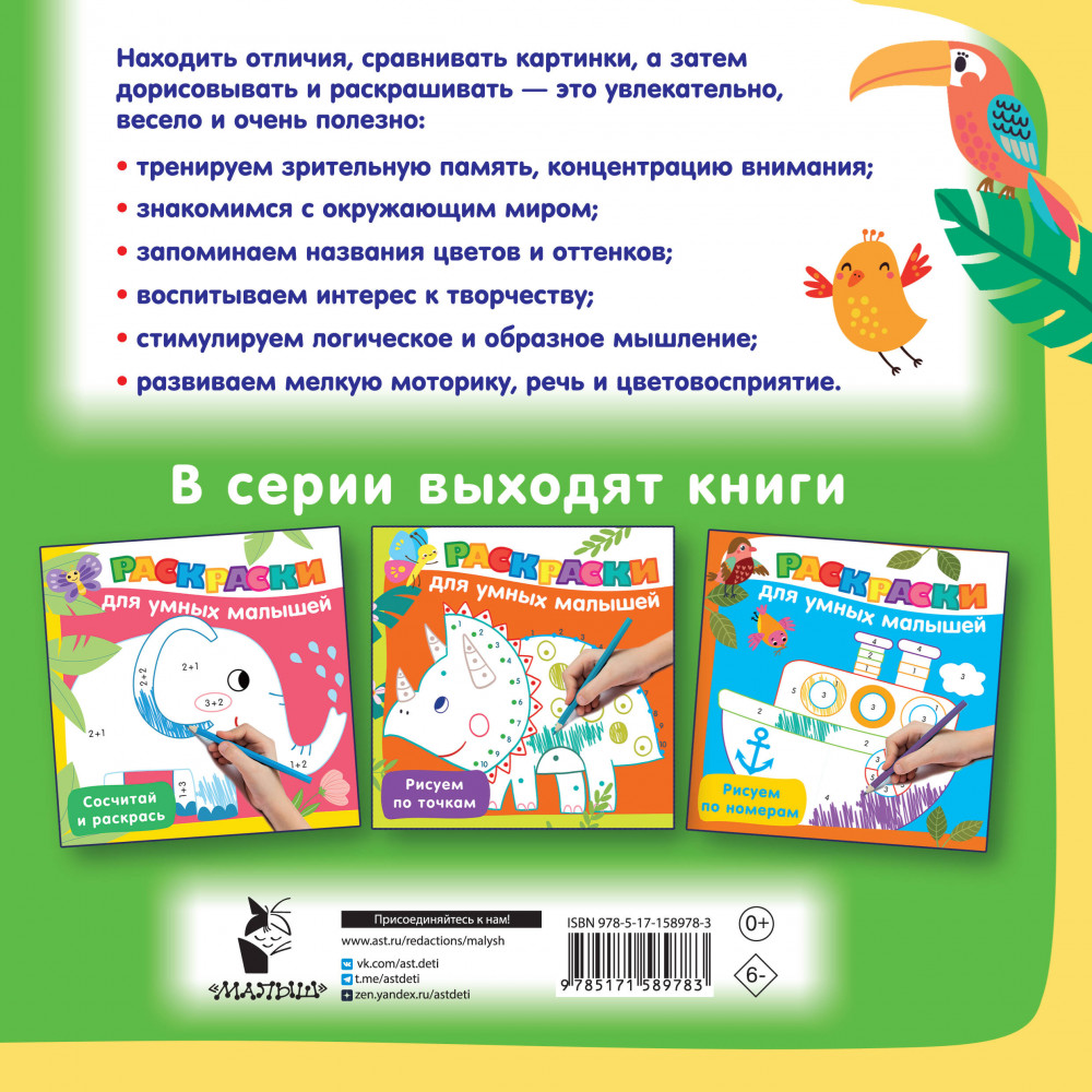 Серия: Раскраски для умных малышей «Найди отличия» — замечательная развивающая раскраска, которая порадует ребёнка и принесёт пользу, ведь поиск отличий — это одновременно и весёлая игра, и эффективная тренировка внимания, логики, зрительной памяти, сосредоточенности, усидчивости, графических навыков. |