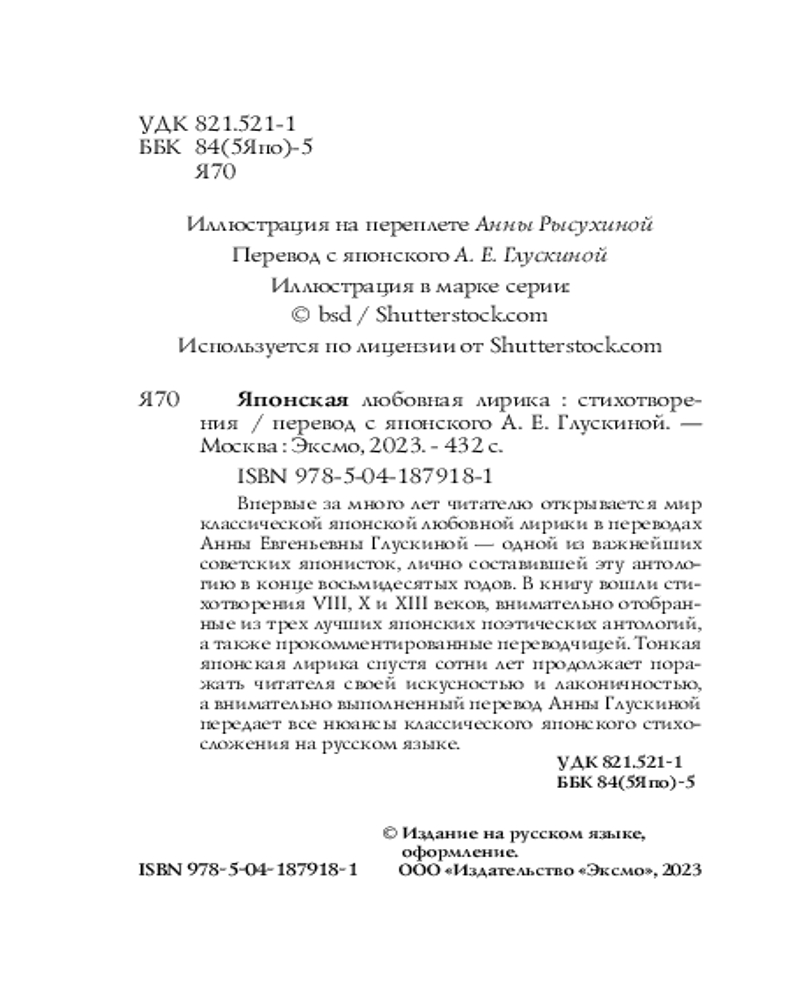 💳 Оплатить за товар можно при получении 🇰🇿 Есть бесплатная доставка по Казахстану 🎁 Копите бонусы с каждой покупки Серия: Собрание больших поэтов Впервые за много лет читателю открывается мир классической японской любовной лирики в переводах Анны Глускиной — одной из важнейших советских японисток, лично составившей эту антологию в конце восьмидесятых годов. Минималистичная, но полная нежности японская поэзия не стареет с веками, вновь и вновь оказываясь поразительно актуальной, помогая преодолеть житейские трудности или выразить казалось бы невыразимые чувства. В книгу вошли стихотворения VIII, X и XIII веков, внимательно отобранные из трёх лучших японских поэтических антологий и прокомментированные переводчицей, работа которой передаёт все нюансы классического японского стихосложения на русском языке. Обновленное оформление серии «Собрание больших поэтов» с иллюстрацией на полный разворот обложки придаёт книге ещё большее изящество, а удобный формат сборника позволяет взять его с собой в дорогу, чтобы погрузиться в мир японской поэзии в любом месте и в любое время. |