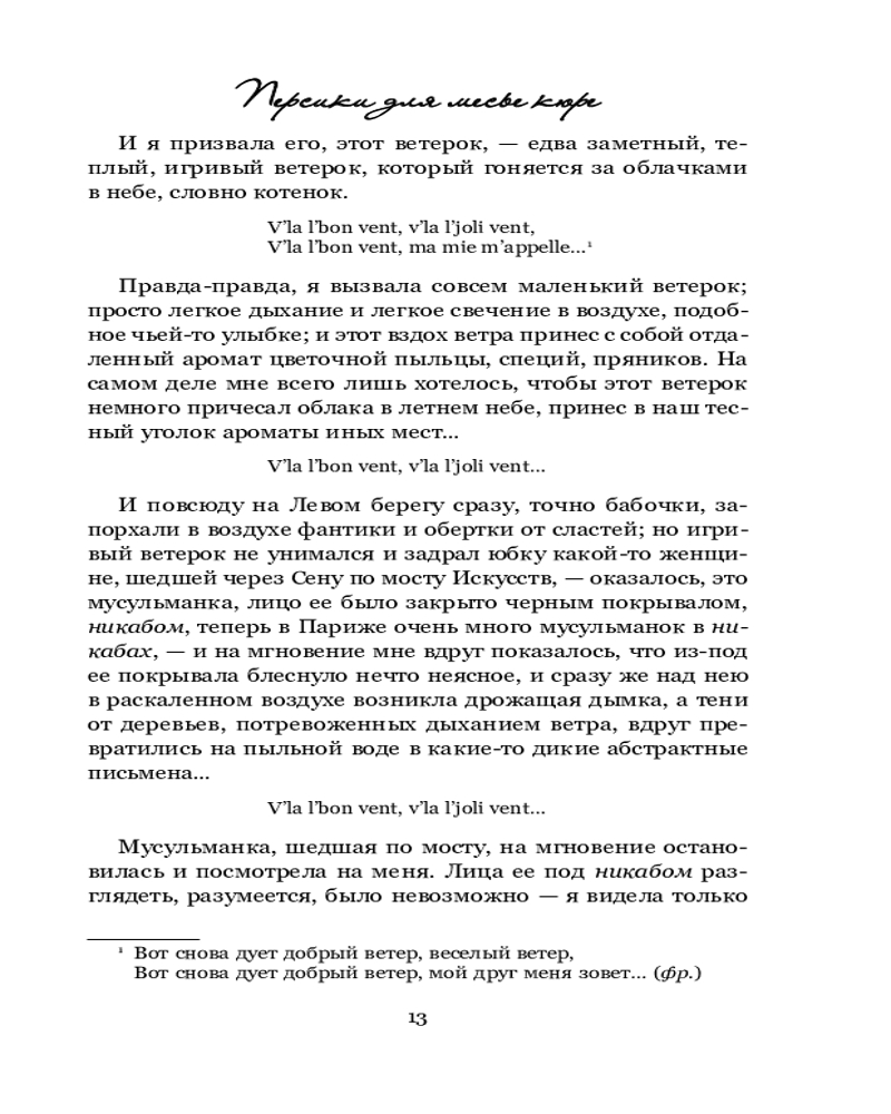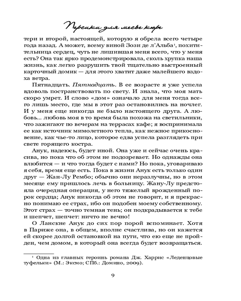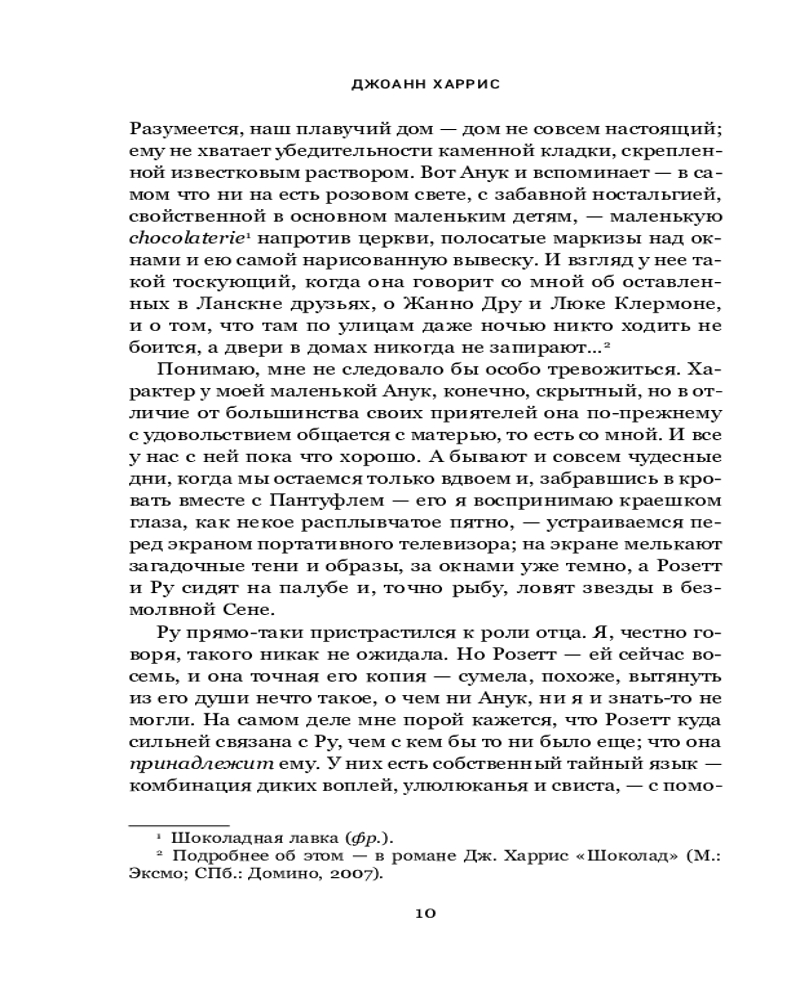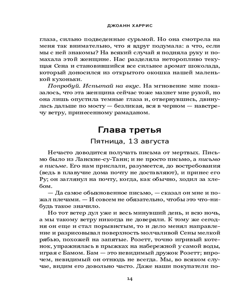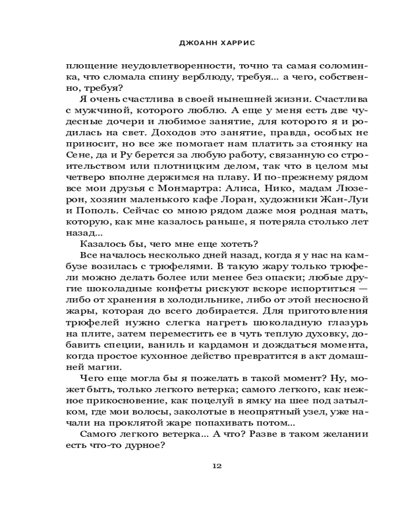 Серия: Novel. Авторская серия Джоанн Харрис Перед вами продолжение романов «Шоколад» и «Леденцовые туфельки». Стоило Вианн обосноваться на берегах Сены, привыкнуть к ровному течению жизни и тысяче повседневных мелочей, как незнакомый ветер снова позвал ее в путь. Он не расскажет Вианн о новых городах, где она никогда не бывала, или о чужеземцах, которых ей только предстоит повстречать. Он принесет ей новости о старых друзьях, которых она не видела уже восемь лет, и нашепчет о переменах, которые пришли на извилистые улочки старого Ланскне вместе с ароматом восточных пряностей и мятного чая. |