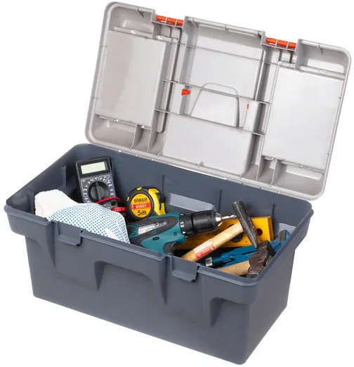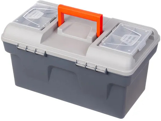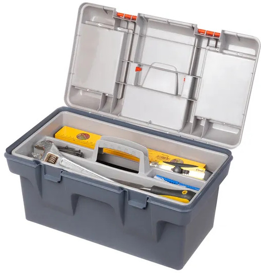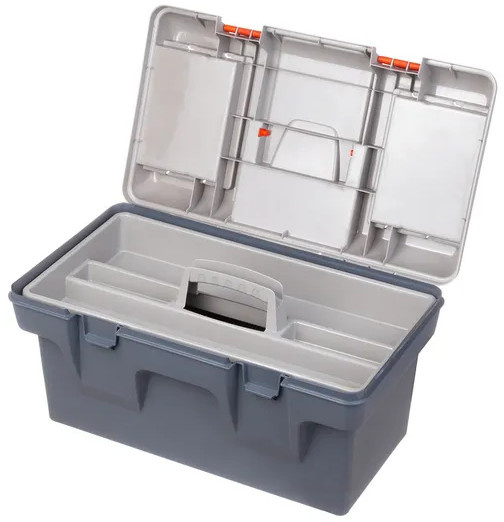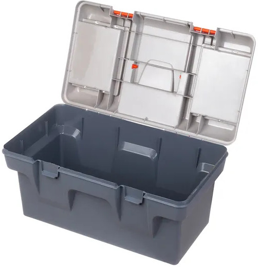 Ящик для инструментов "Массимо"48,5×29×25,5 см выполнен из прочного пластика. Внутри контейнер имеет 2 яруса. Общий объем 19 литров. Верхний ярус-вкладыш 47×23,5×5,5 см съемный, имеет 4 отделения и ручку. На крышке сверху есть 2 съемных органайзера по 17×12×3,5 см с ячейками для мелочей. Органайзеры имеют по 4 отделения разных размеров. Их будет удобно использовать для болтов, саморезов, гаек, гвоздей, дюбелей. Большой бокс подойдет для хранения основного инструмента — дрель, болгарка, перфоратор и другие.