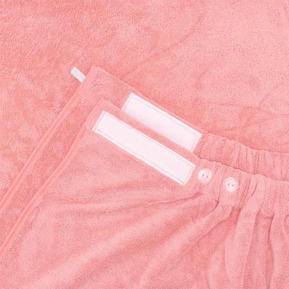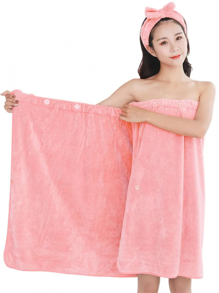 Большое, ниже колен при росте 1.60, очень мягкое, приятное к телу. Липучки надёжные, но есть ещё и дополнительное крепление на пуговицы. Особенно удобно, что они есть и посередине, полотенце не распахивается.