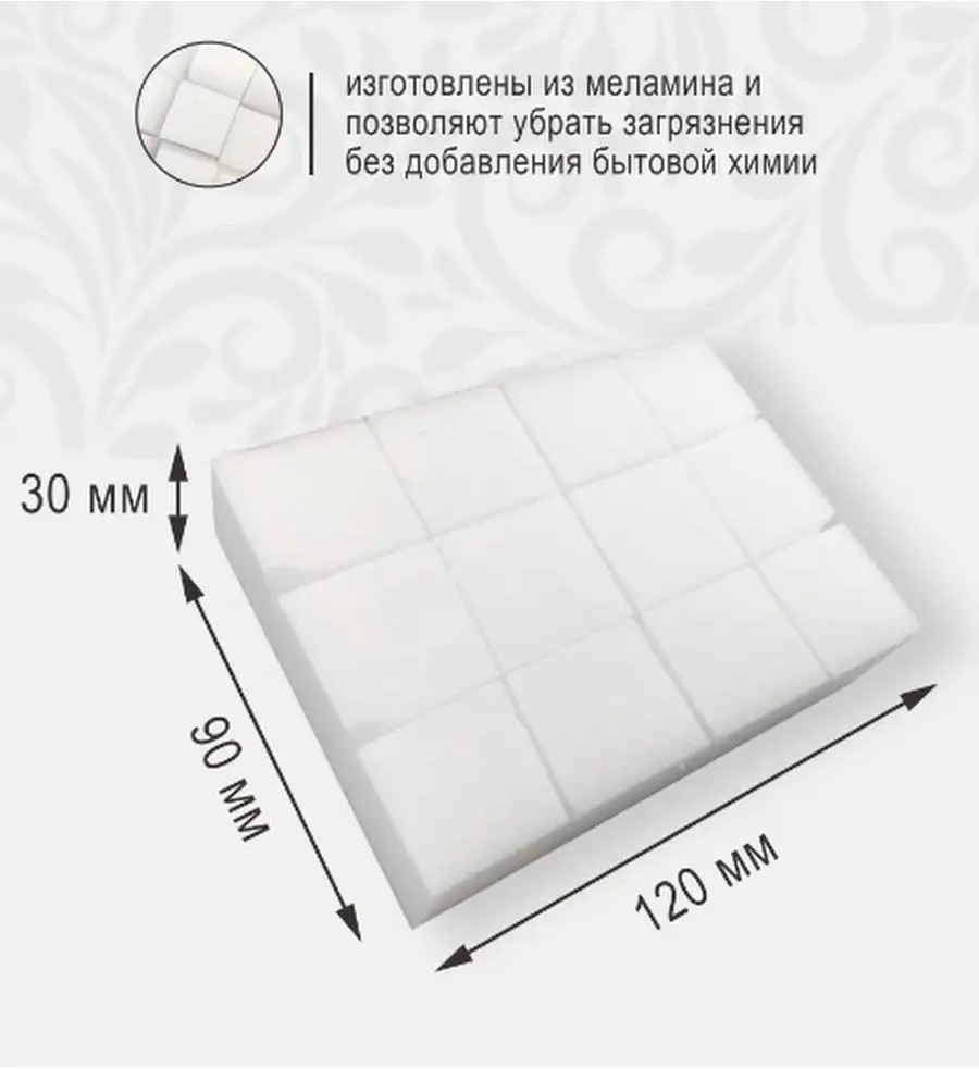 В данный момент этот товар отсутствует в продаже. Возможно, у нас найдется аналогичный или похожий товар здесь. Губка состоит из 100% вспененного меламина (моющего вещества). Можно использовать как ластик, который удаляет застарелые загрязнения различного рода на кафеле, обуви, пластике, коже и других поверхностях. Другие моющие средства вместе с ней не применяются, меламиновая губка сама является моющим средством при взаимодействии с водой.