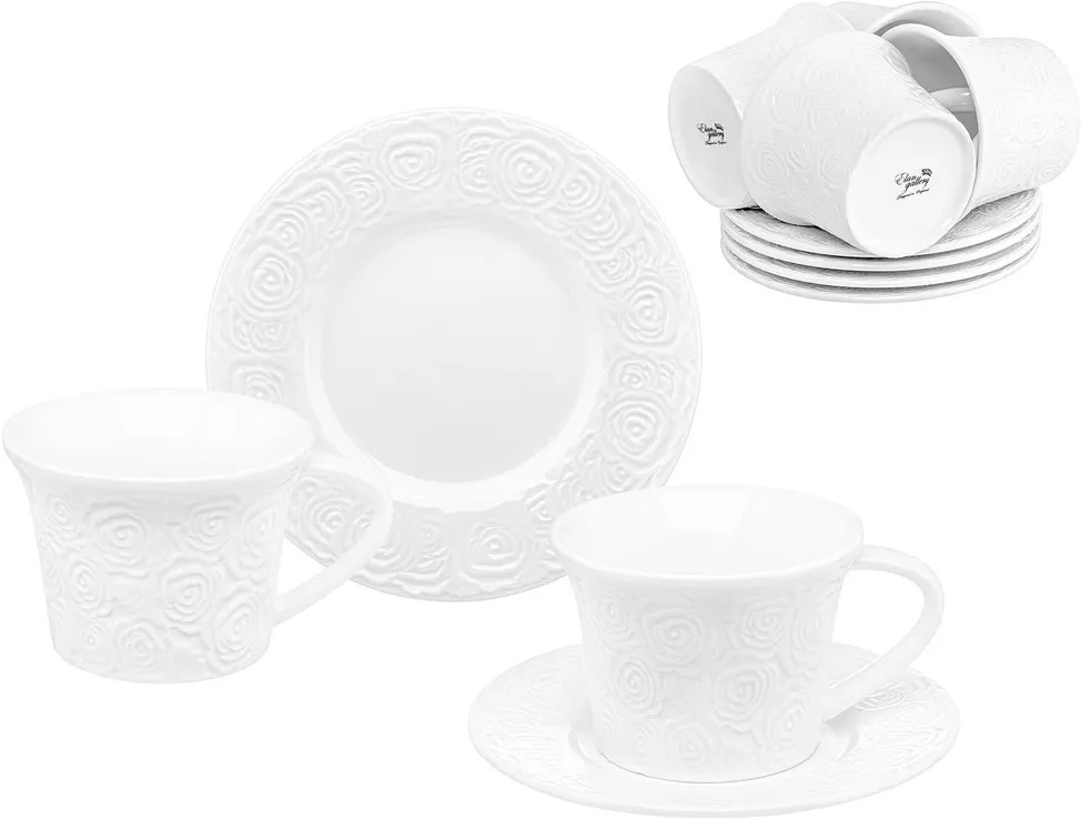 Чайный набор серии «Розы» включает 12 предметов. Чайная пара состоит из чашки объемом 220 мл и блюдца диаметром 15 см. Используйте набор как чайный или кофейный. Чашка с блюдцем помогут провести множество вкусных завтраков с капучино или латте или уютных вечеров с любимым горячим напитком.