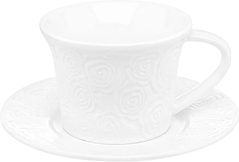 Набор выполнен из высококачественного белого фарфора и украшен декоративными рельефными узорами. Фарфоровая посуда отличается от керамики повышенной плотностью. Фарфор не впитывает цвет кофе или чая и не деформируется от влаги, чему может быть подвержена керамическая посуда. Кружку и тарелку можно использовать в СВЧ и ПММ. Поставляются в стильной картонной упаковке. Красивая чайная пара из серии посуды «Розы» станет настоящим украшением вашей сервировки или приятным подарком для родных и близких.