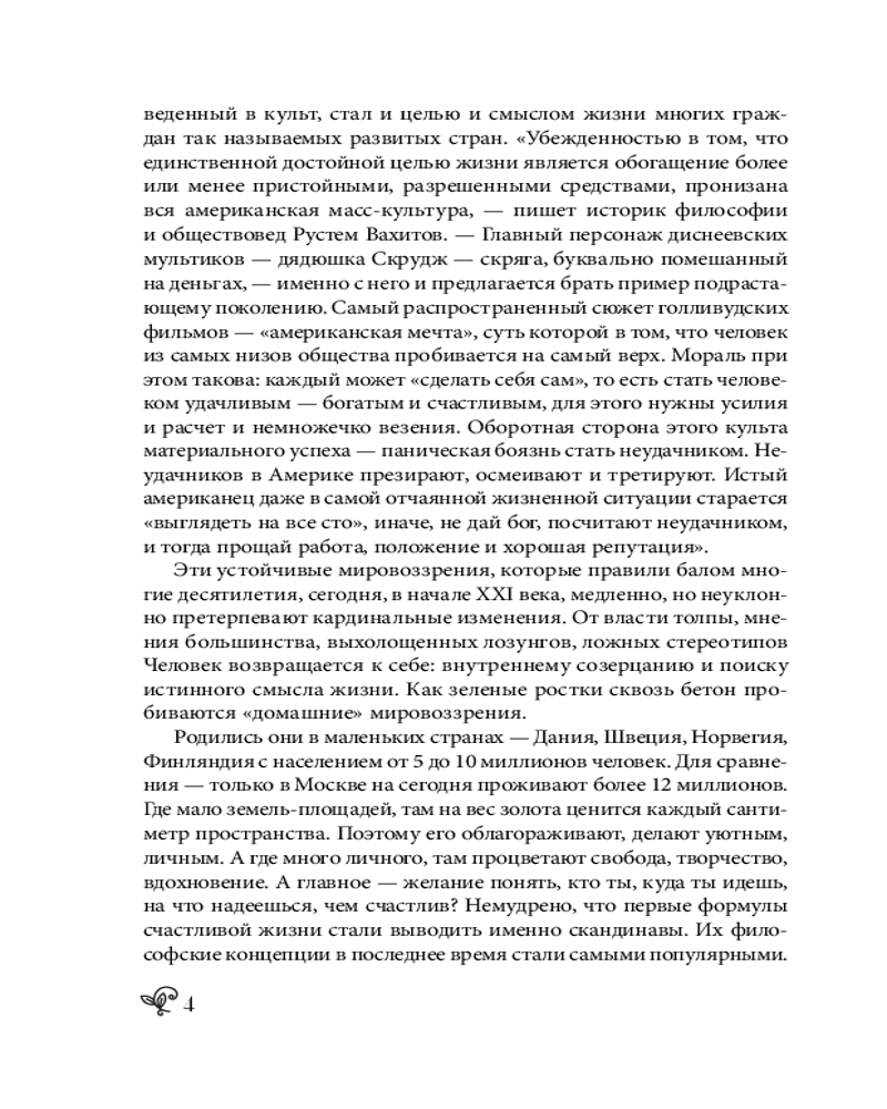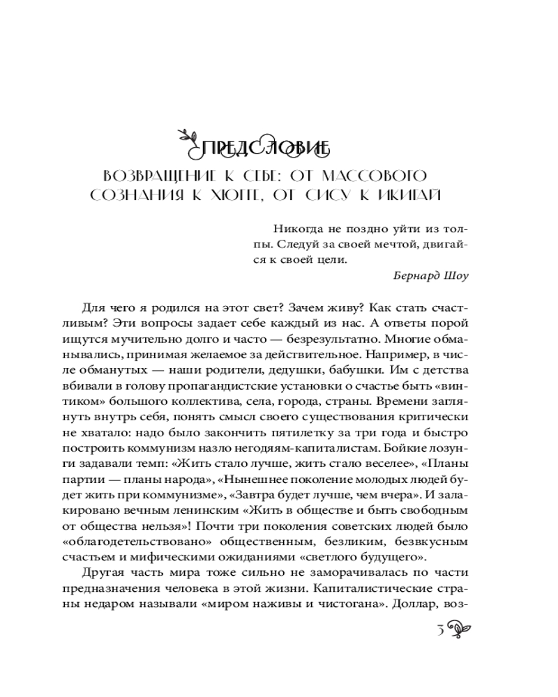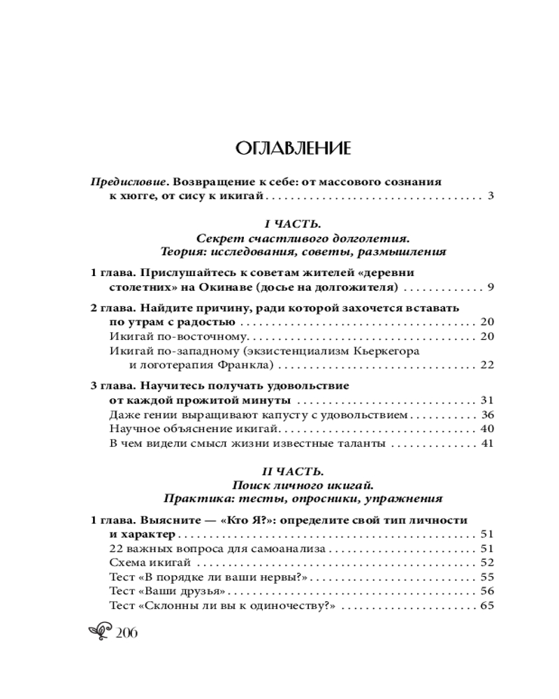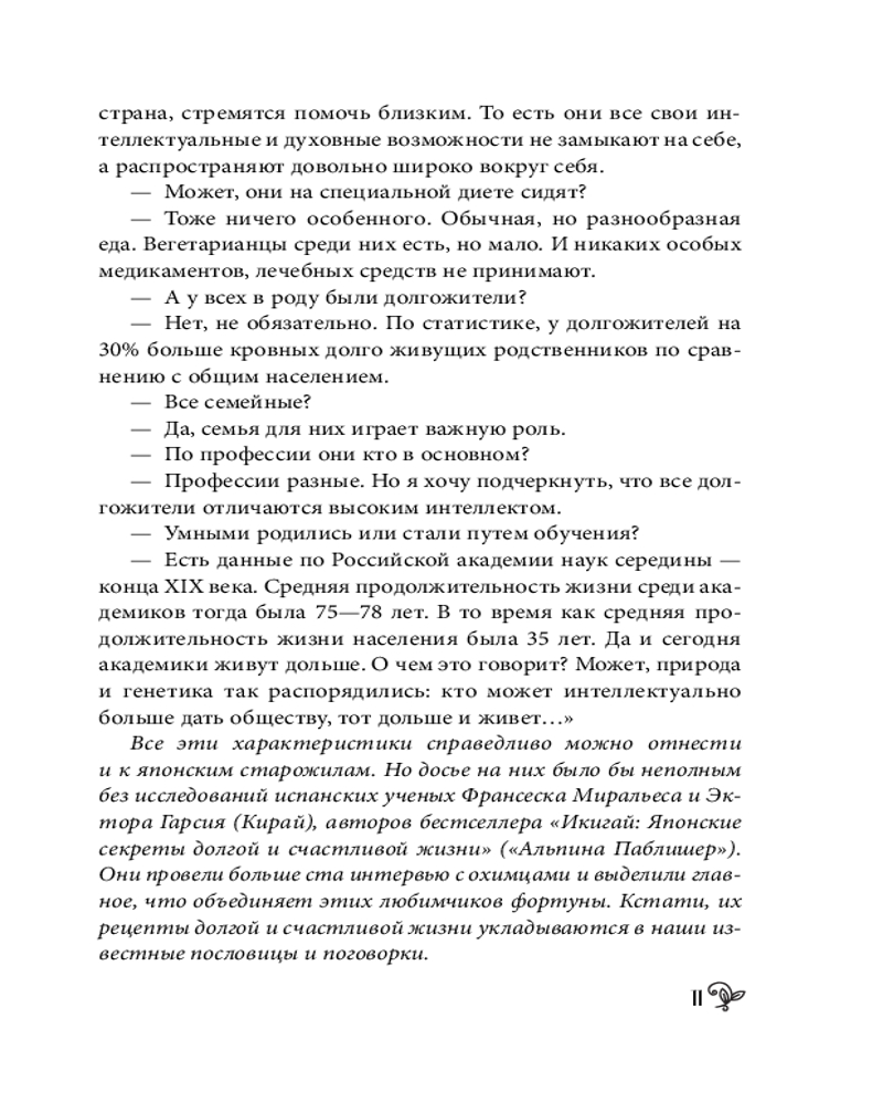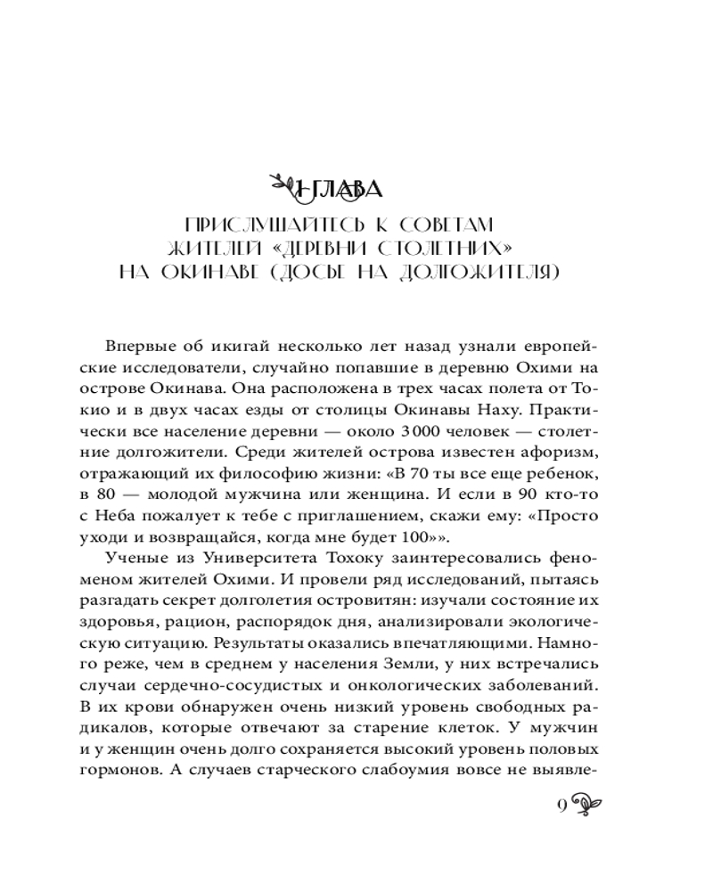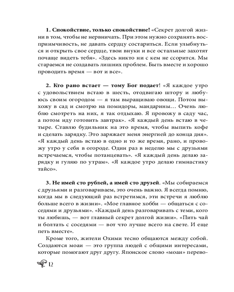 В более широком понимании оно означает «смысл жизни» или «предназначение». Тот, кто обладает икигай, проживет долгую, здоровую и счастливую жизнь. Так считают жители японской деревни Охими на Окинаве. Она известна на весь мир тем, что именно здесь люди живут почти до 100 лет. Изучая этот феномен, исследователи пришли к выводу: секрет долгожительства действительно скрыт в том, что человек видит цель своей жизни и знает, ради чего живет. Убедиться в этом вы можете сами, найдя свой личный икигай после прочтения этой книги.