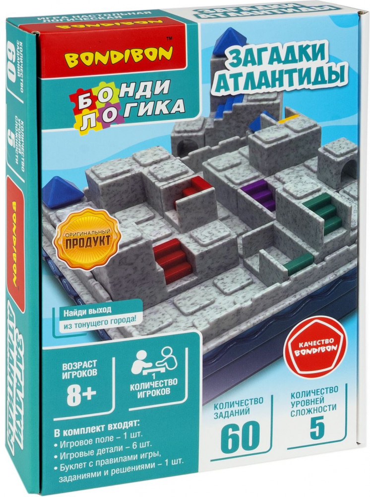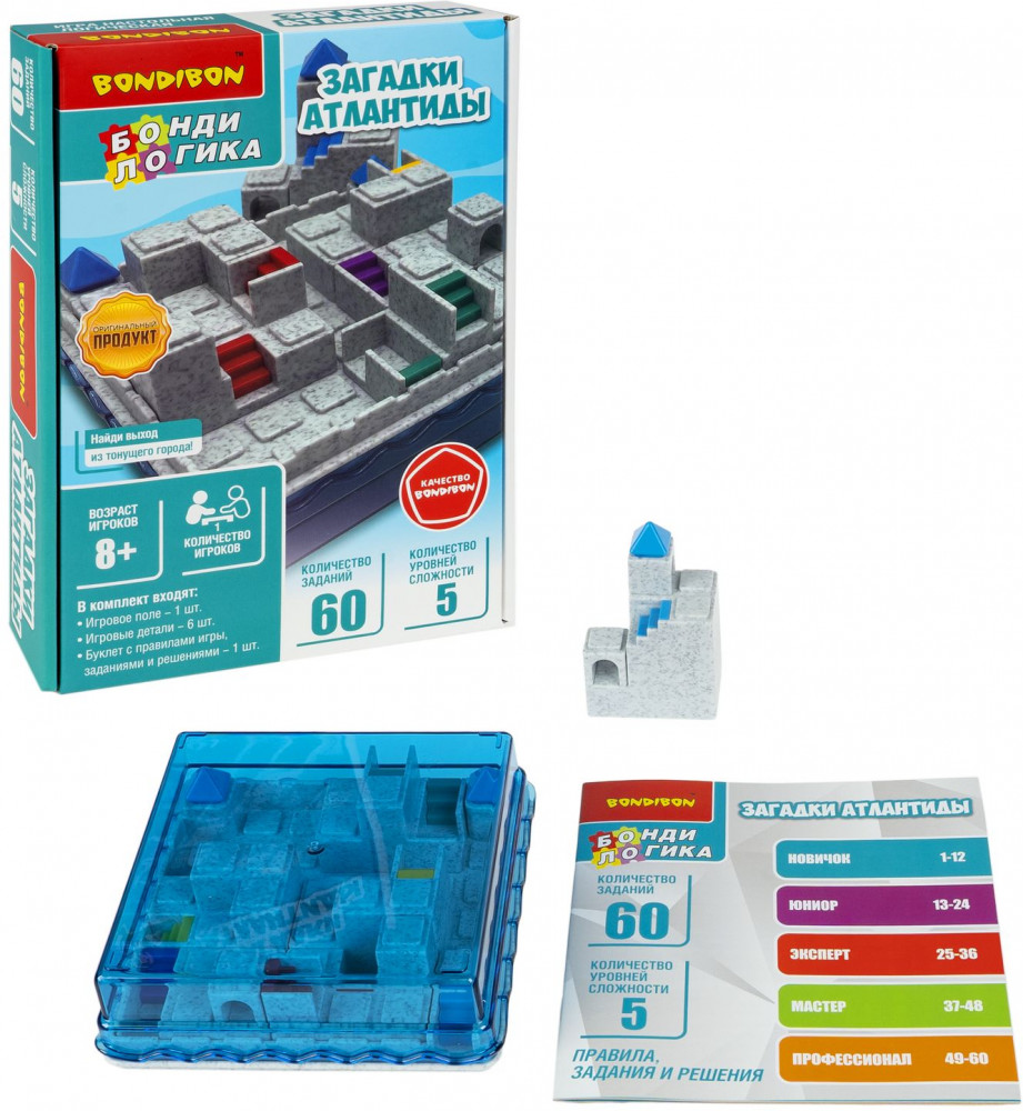 Можете ли Вы сбежать из Атлантиды, прежде чем красивый город исчезнет под водой? Игра содержит: игровую доску с синей прозрачной крышкой, высокую башню, 5 деталей с лестницами, мостами и туннелями, буклет с 60 заданиями и их решениями. Игра предназначена для одного игрока в возрасте от 8 лет. Цель игры: проложить кротчайший путь от высокой башни к выходу, используя детали головоломки с лестницами, мостами и туннелями.