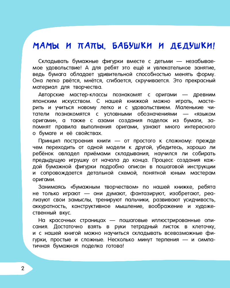 Серия: Большой самоучитель для маленьких Складывать бумажные фигурки вместе с детьми — незабываемое удовольствие! А для ребят это ещё и увлекательное занятие, ведь бумага обладает удивительной способностью менять форму. Она легко рвётся, мнётся, сгибается, скручивается. Это прекрасный материал для творчества. |