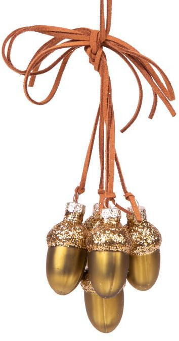 Елочные игрушки в форме желудей — интересная альтернатива традиционным шишкам в качестве декора новогоднего дерева. Желуди необычно оформлены, они усыпаны множеством блестящих деталей, создающих причудливую игру света и теней. Материал игрушек — стекло, для оформления выбраны сдержанные оттенки, которые красиво будут смотреться в декоре самых разных направлений.