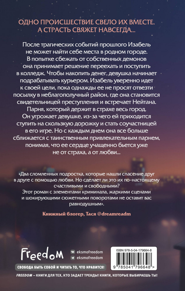Соучастники в любвиВ данный момент этот товар отсутствует в продаже. Возможно, у нас найдется аналогичный или похожий товар здесь. Серия: Young Adult. Молодежная российская романтическая проза После трагических событий прошлого Изабель не может найти себе места в родном городе. В попытке сбежать от собственных демонов, она принимает решение переехать и поступить в колледж. Чтобы накопить денег, девушка начинает подрабатывать курьером. Изабель уверенно идет к своей цели, пока однажды ее не просят отвезти посылку в неблагополучный район, где она становится свидетельницей преступления и встречает Нейтана. Парня, который держит в страхе весь город. Он угрожает девушке, из-за чего ей приходится ступить на скользкую дорожку и стать соучастницей в его игре. Но с каждым днем она все больше сближается с таинственным привлекательным парнем, понимая, что ее сердце учащенно бьется уже не от страха, а от любви... |