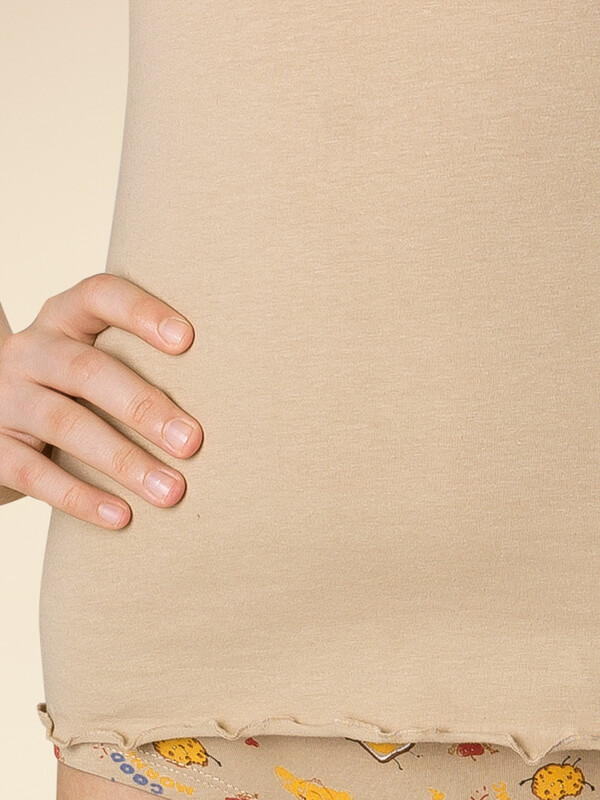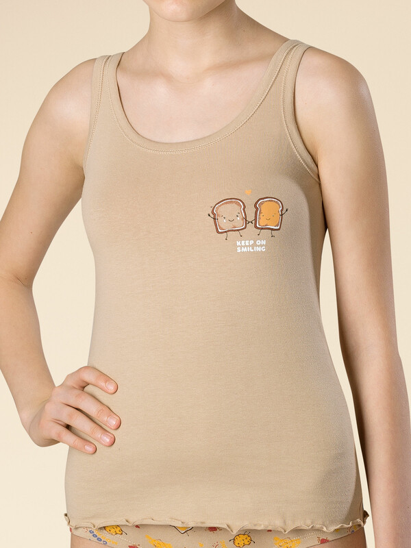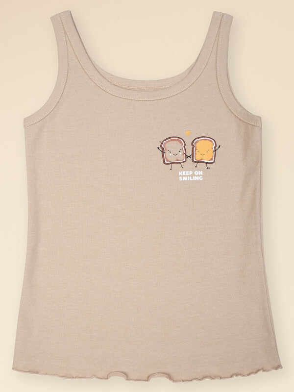 Майка выполнена в модном натуральном оттенке «овсяное молоко» и украшена милым лаконичным принтом в стиле «хюгге» с позитивным текстом. Перевод: «Продолжай улыбаться». Принт мягкий и долговечный, замечательно переносит стирки. По низу изделие декорировано отделкой «салатный край», придающей модели изящности.