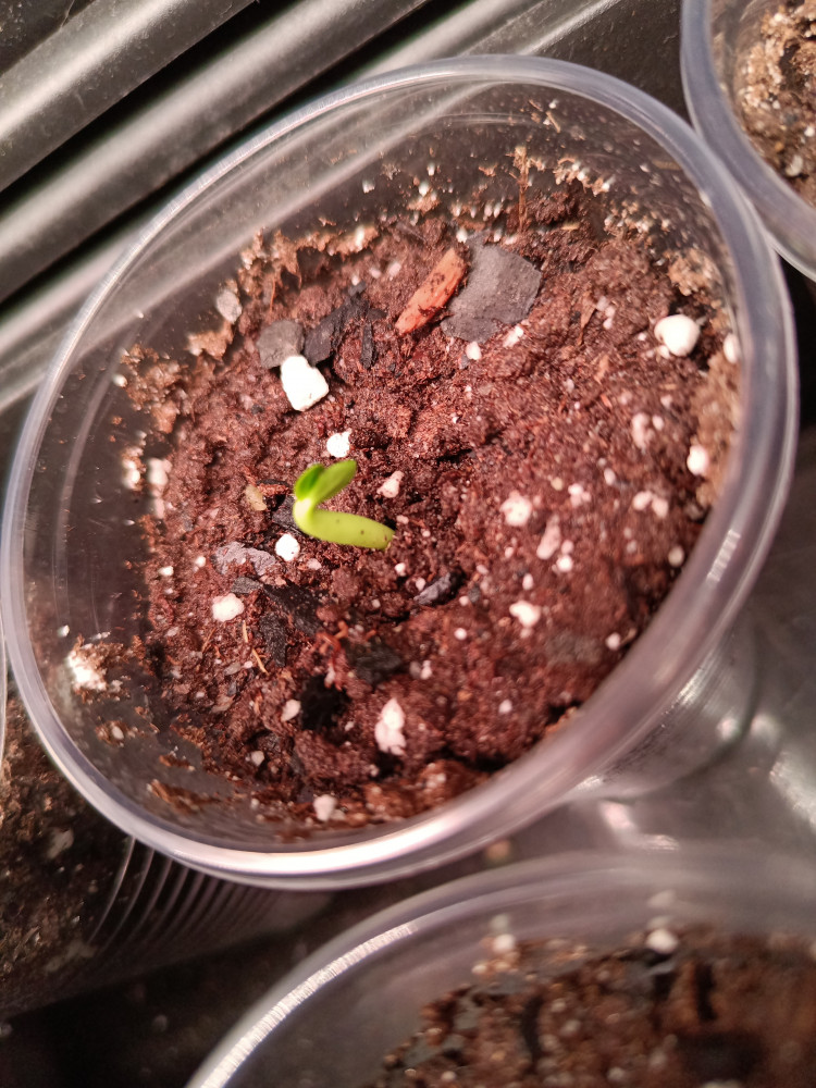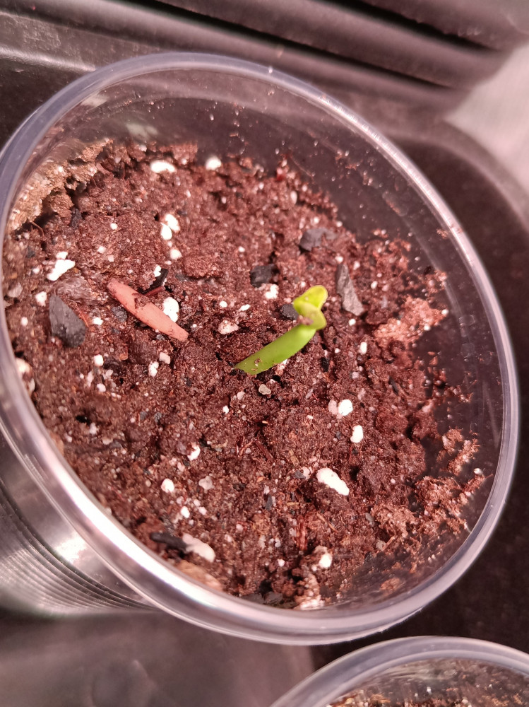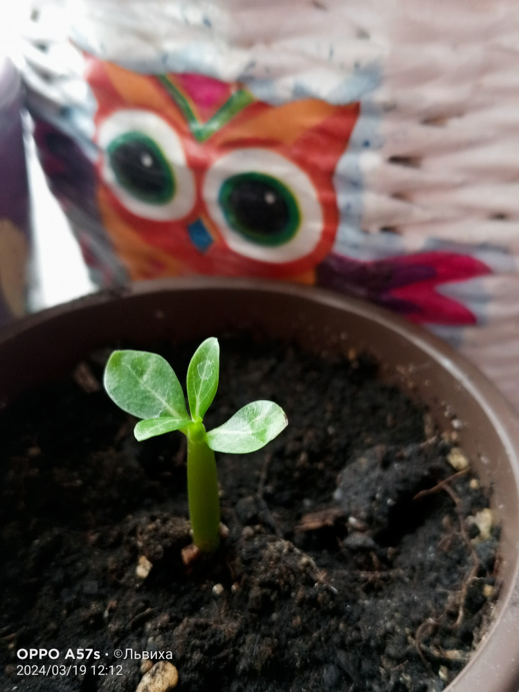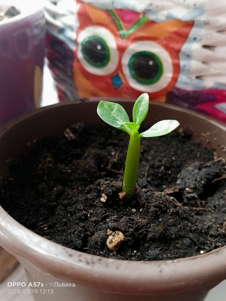 Посадила 16 января, а уже 18 января все три семечки проклюнулись. Всё делала по инструкции, вымачивала в Цирконе 4 часа, потом купила грунт для кактусов, уголь древесный, перлит - все смешала, увлажнила хорошо и накрыла плёнкой пищевой. Температура дома 26 гр, свет - обычная светодиодная. 1 раз опрыскивала.