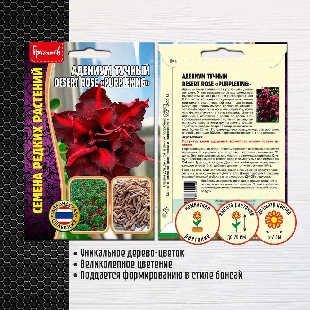 Григорьев Адениум тучный desert rose «PurpleKing»В данный момент этот товар отсутствует в продаже. Возможно, у нас найдется аналогичный или похожий товар здесь. Серия: Семена редких растений Адениум тучный (адениум толстый) — вид невысоких деревьев или полукустарников семейства Куртовые. Листья темно-зеленого цвета с заостренной или туповатой верхушкой. Форма листовой пластины ланцетная, поверхность глянцевая. Его однотонные цветки малинового или бордового оттенка, в сочетании с плотным стволом, выглядят очень экзотично и красиво. Это цветочное чудо в вашем доме. Цветет Адениум в основном с весны по осень. При соблюдении оптимальных условий выращивания может цвести почти круглогодично. Существуют экземпляры, возраст которых насчитывается более 75 лет. По утверждению разводчиков, эти растения способны жить до 200 лет, переходя из поколения к поколению. |
