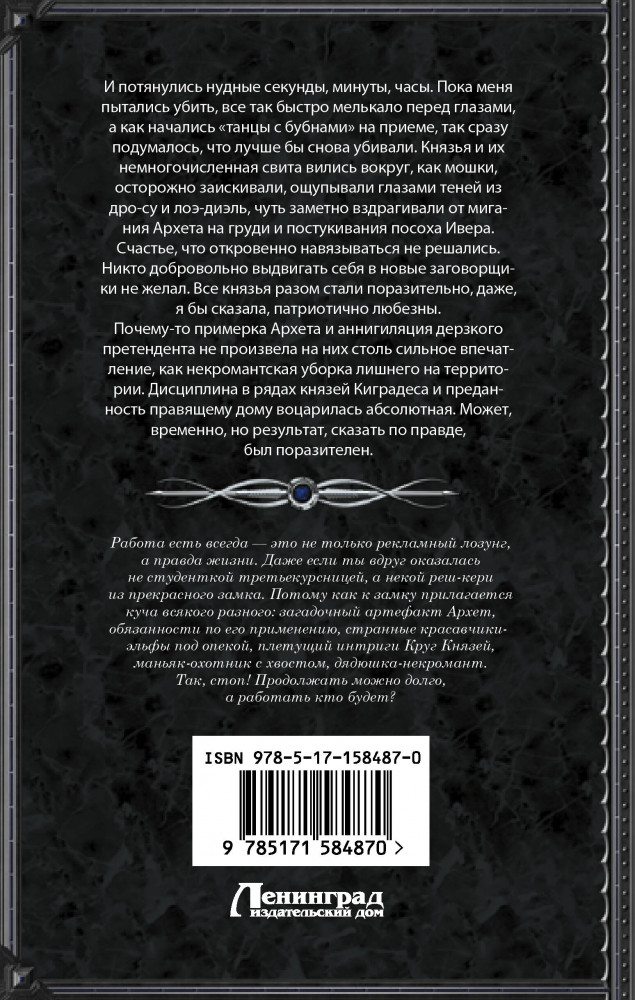 Серия: Другие миры Работа есть всегда — это не только рекламный лозунг, а правда жизни. Даже если ты вдруг оказалась не студенткой третьекурсницей, а некой реш-кери из прекрасного замка. Потому как к замку прилагается куча всякого разного: загадочный артефакт Архет, обязанности по его применению, странные красавчики-эльфы под опекой, плетущий интриги Круг Князей, маньяк-охотник с хвостом, дядюшка-некромант. Так, стоп! Продолжать можно долго, а работать кто будет? |