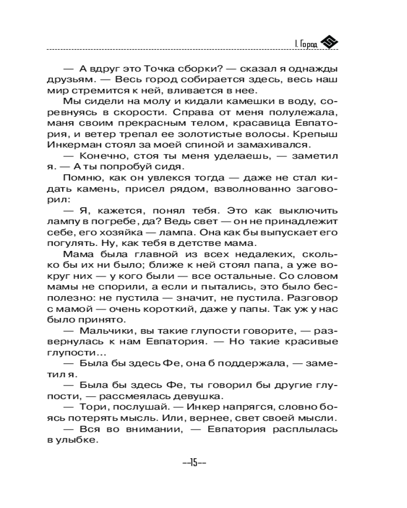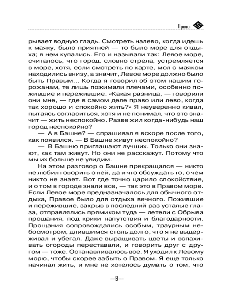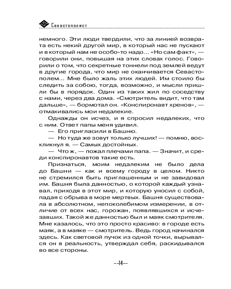 Серия: Mainstream. Фантастика Будущего Добро пожаловать в Севастополь — единственный город в мире, город, где все смотрят в небо. Здесь, в двухэтажных домиках с тенистыми садами, царит мирная беззаботная жизнь без каких-либо бытовых проблем. Из города нет выхода, но жители счастливы и не стремятся его покинуть. А на горизонте, у линии возврата, возвышается Башня, и никто не помнит, зачем она построена и что там находится. |