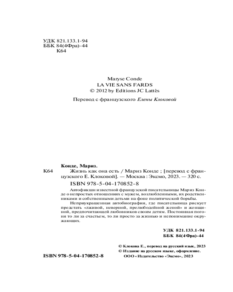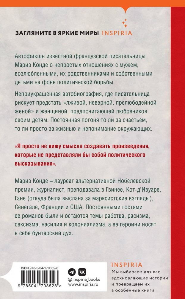 Серия: Loft. Мариз Конде Автофикшен известной французской писательницы Мариз Конде о непростых отношениях с мужем, возлюбленными, их родственниками и собственными детьми на фоне политической борьбы. |