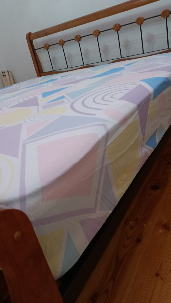 Очень понравилась простынь и цветовой гаммой, и ценой, и пошивом. Хотя немного просвечивает, кто любит плотнее, учтите, это бязь, не поплин. Бязь — это низкая цена и хорошая износостойкость. Поплин — это соотношение тактильных ощущений, мягкости. Ткань гладкая, грубоватая, но после стирки и полоскания с кондиционером становится мягче. Цвет после первой стирки не потеряла, не скаталась. Подсела не значительно, на матрас 158-200 села идеально. Что важно, простынь с резинкой по периметру, а не так,как другие только по углам. Фотографию предоставлять не буду, смотрите отзыв предыдущего покупателя.