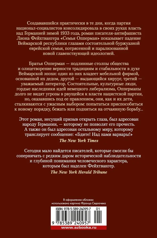 Серия: Иностранная литература. Большие книги Создававшийся практически в те дни, когда партия национал-социалистов консолидировала в своих руках власть над Германией зимой 1933 года, роман писателя-антифашиста Лиона Фейхтвангера «Семья Опперман» показывает падение Веймарской республики глазами состоятельной буржуазной еврейской семьи, потрясенной и парализованной новой главенствующей идеологией. |