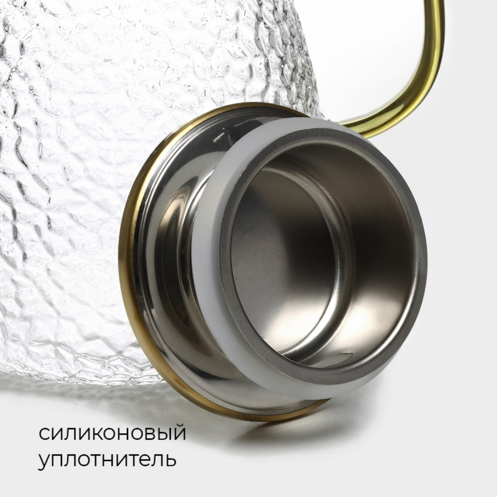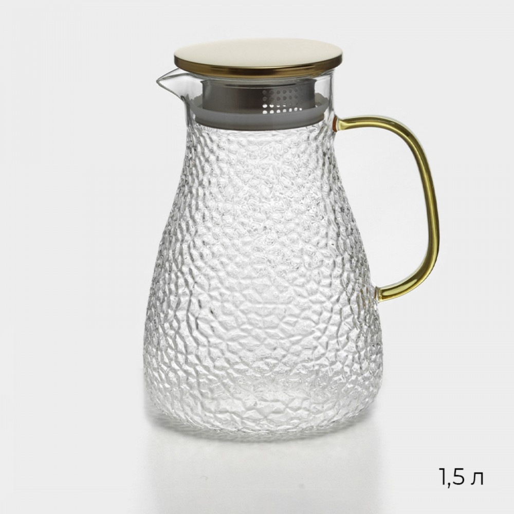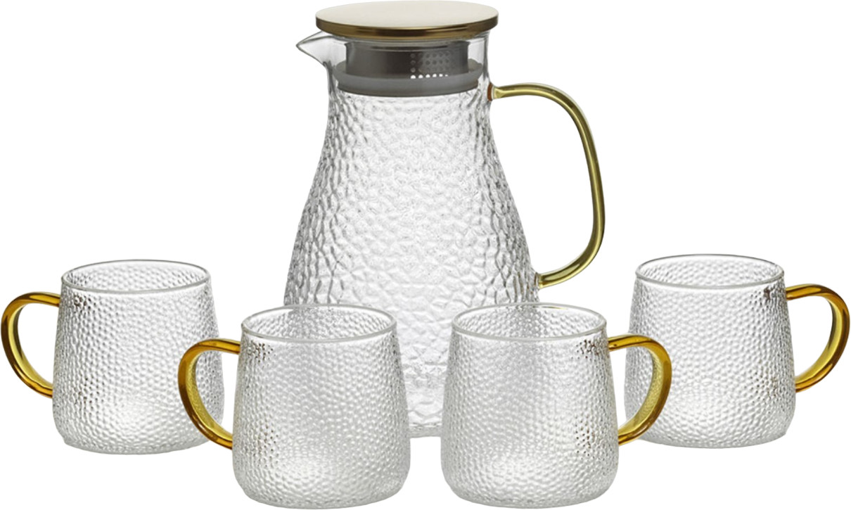 Набор питьевой включает в себя 5 предметов: кувшин и четыре кружки. Предметы изготовлены из качественного прочного стекла с покрытием. Кувшин с металлической крышкой, в которой есть фильтр. Изделия имеют эргономичные ручки, кувшин оснащён удобным носиком.