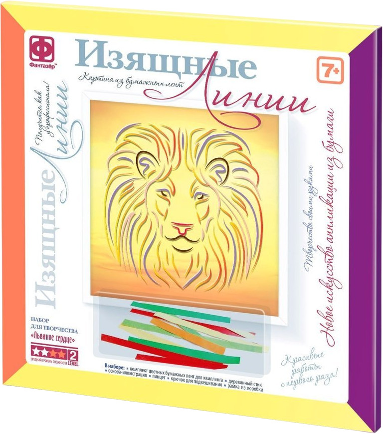 Для создания картины вам не потребуется клей, а простая техника будет доступна взрослым любого возраста и детям от 7 лет. В наборе предусмотрена рамка, которая гармонично обрамляет получившееся произведение и создает эффект законченности картины. Процесс аппликации с бумажными лентами увлекает, затягивает и приносит спокойное удовлетворение как новичкам, так и любителям творческих занятий с любым уровнем подготовки. А восхитительный результат «Изящных линий» непременно привлечет к себе внимание и порадует любого зрителя.