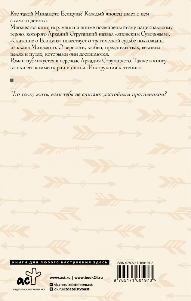 Переиздание одного из наиболее классических произведений в японской литературе и в максимально полном переводе Аркадия Стругацкого. “Вечный” сюжет повествующий о нелегкой судьбе молодого военачальника Минамато-но-Ёсицунэ - личности настолько важной в японской истории, что его влияние практически невозможно измерить каким-либо образом. Человека, жившего на изломе эпох в 12-м веке и стоявшего у истоков становления первого (камакурского) сёгуната, а соответственно и в становлении самураев из обычных вооруженных мужчин в военную аристократию и доминирующее сословие в японском обществе, которое определяло жизнь страны на протяжении многих веков вплоть до Реставрации (революции) Мэйдзи в 19-м веке. Настоятельно рекомендуется к прочтению каждому, кого интересуют истоки появления самураев, кодекса бусидо, военной структуры бакуфу и сёгуната, Войны Гэмпэй (хотя для более полного и подробного описания данного события советую также ознакомится с монументальной «Повестью о Доме Тайра») и её последствий для японского самосознания, а также просто история жизненного пути юного воина, который трагически оборвался уже к 30 годам, хотя сам Ёсицунэ по сей день является воплощением всех самурайских добродетелей и был, как принято о нём отзываться, Самураем из Самураев. Недостижимым идеалом. Персонификацией всех постулатов Бусидо.