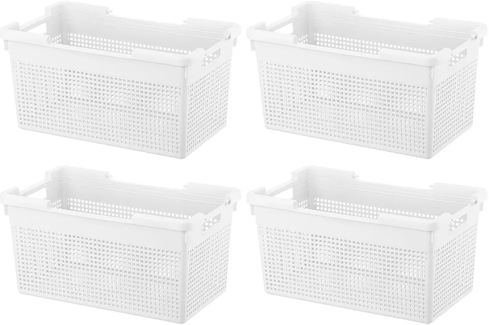 В состав набора входят четыре корзины с крышками. Органайзеры выполнены из полипропилена. Преимущество данного материала над обычным пластиком в том, что он легкий по весу и наиболее безопасный для здоровья. В универсальном контейнере цвета латте можно хранить как овощи и фрукты, так и кухонные и хозяйственные принадлежности. Используйте ёмкость для косметики, бытовой химии, моющих средств. Специальное плетение с дырочками позволяет воздуху проникать внутрь и не дает продуктам испортиться от недостатка кислорода. Корзина может быть использована для белья, полотенец и хранения различных мелочей. Такую подставку можно поставить под раковину в ванной, возле стиральной машины или на полку. Ящички можно хранить компактно — один в другом. Используйте в детской комнате как стеллаж или ящик для игрушек. Товары представлены разных объемов, форм и расцветок, что позволит собрать уникальный набор, подходящий под ваши потребности.