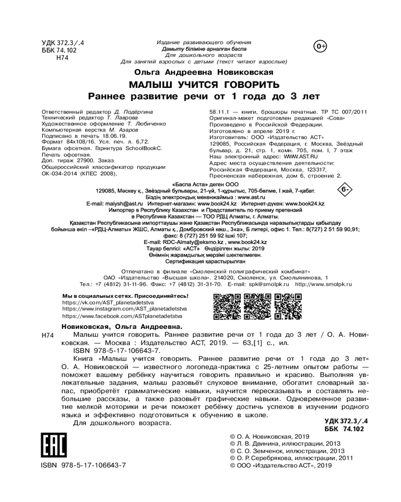 Малыш учится говорить. Раннее развитие речи от 1 года до 3 летВ данный момент этот товар отсутствует в продаже. Возможно, у нас найдется аналогичный или похожий товар здесь. Книга О. А. Новиковской «Малыш учится говорить. Раннее развитие речи от 1 года до 3 лет» — известного логопеда-практика с 25-летним опытом работы — поможет вашему ребёнку научиться говорить правильно и красиво. Выполняя увлекательные задания, малыш разовьёт слуховое внимание, обогатит словарный запас, приобретёт грамматические навыки, научится пересказывать и составлять небольшие рассказы, а также разовьёт графические навыки. Одновременное развитие мелкой моторики и речи поможет ребёнку достичь успехов в изучении родного языка и эффективно подготовиться к обучению в школе. |
