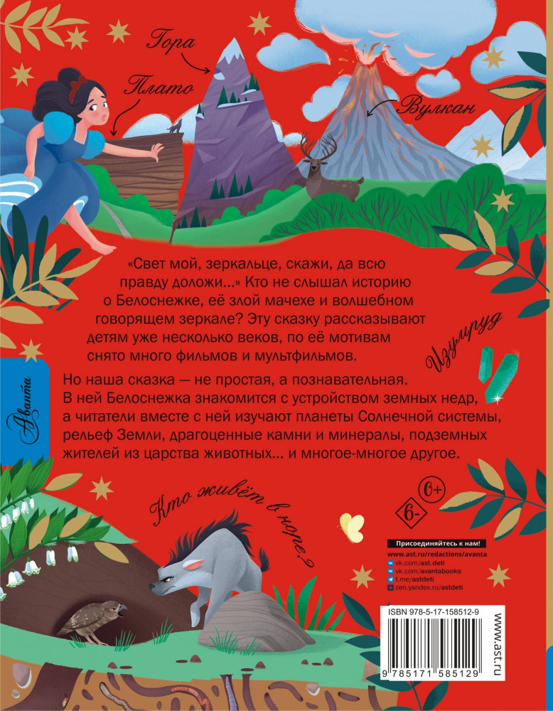 Серия: Познавательные сказки «Свет мой, зеркальце, скажи, да всю правду доложи...» Кто не слышал историю о Белоснежке, её злой мачехе и волшебном говорящем зеркале? Эту сказку рассказывают детям уже несколько веков, по её мотивам снято много фильмов и мультфильмов. Но наша сказка — не простая, а познавательная. В ней Белоснежка знакомится с устройством земных недр, а читатели вместе с ней изучают планеты Солнечной системы, рельеф Земли, драгоценные камни и минералы, подземных жителей из царства животных... и многое-многое другое. Книгу украшают чудесные иллюстрации Светланы Зориной. Для младшего школьного возраста. |